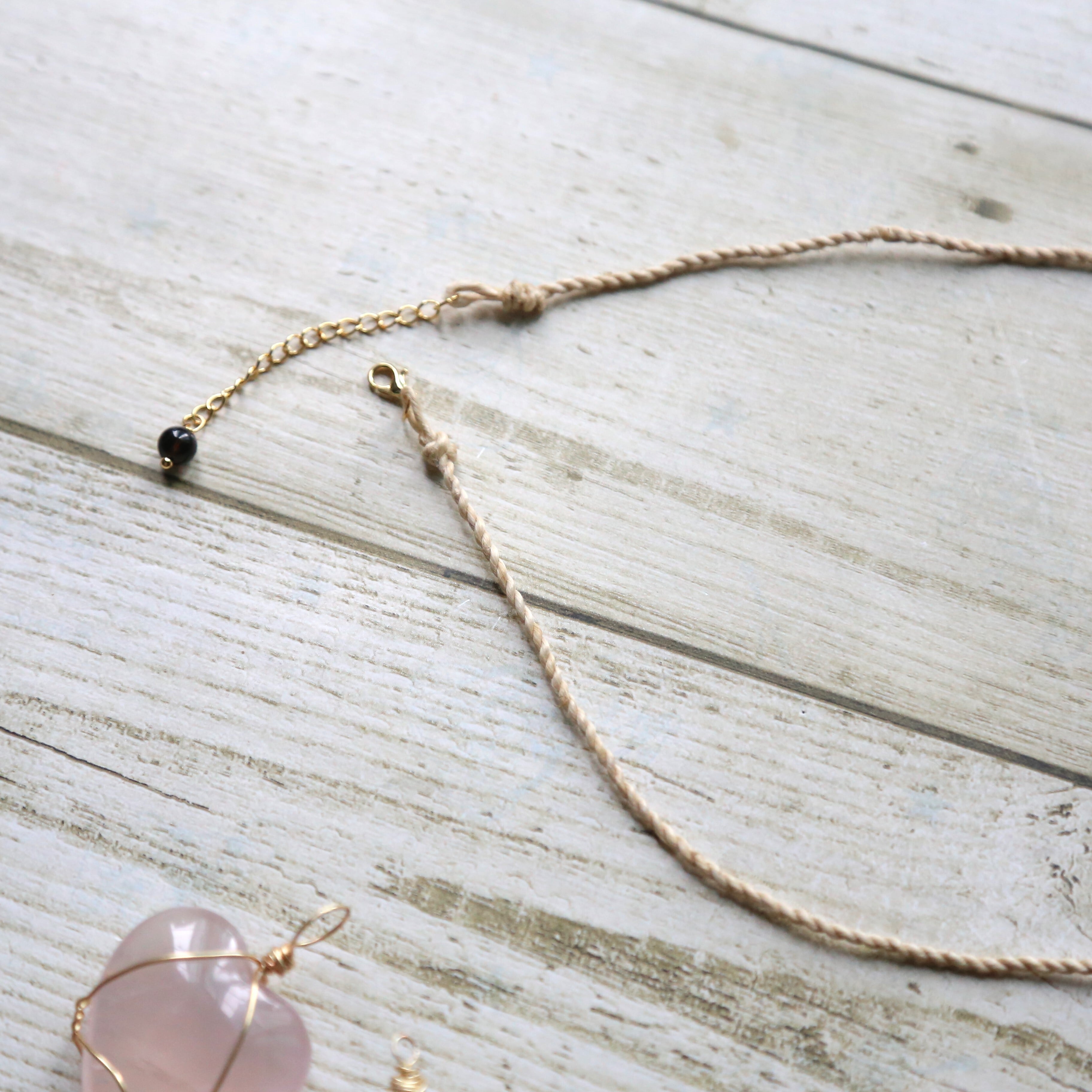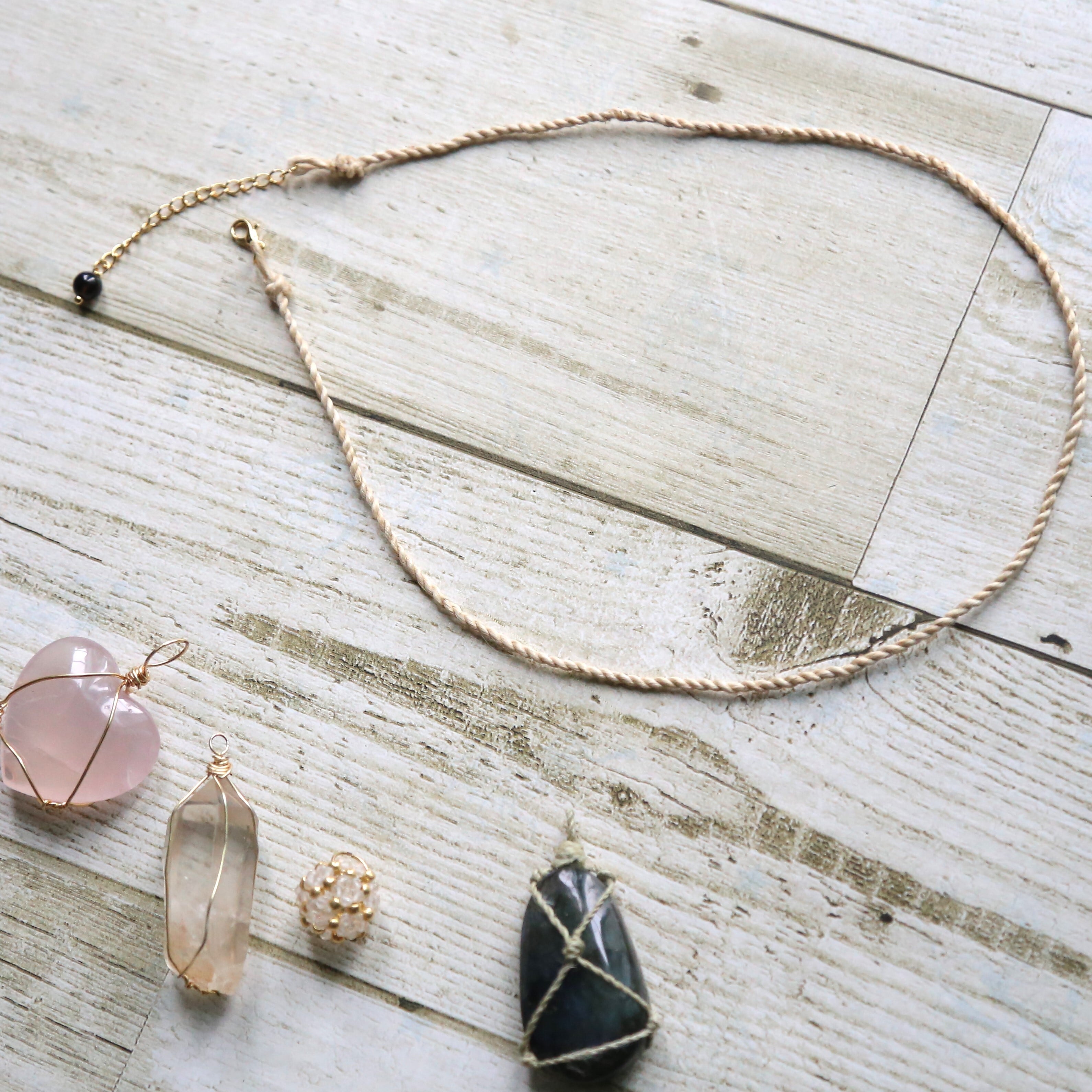 精麻のより紐に、アジャスターで長さ調整可能な金具(16金コーティング)、そしてエネルギー的にも守っておきたい首の後ろ側にあたるアジャスター部分にはモリオンを付けました!