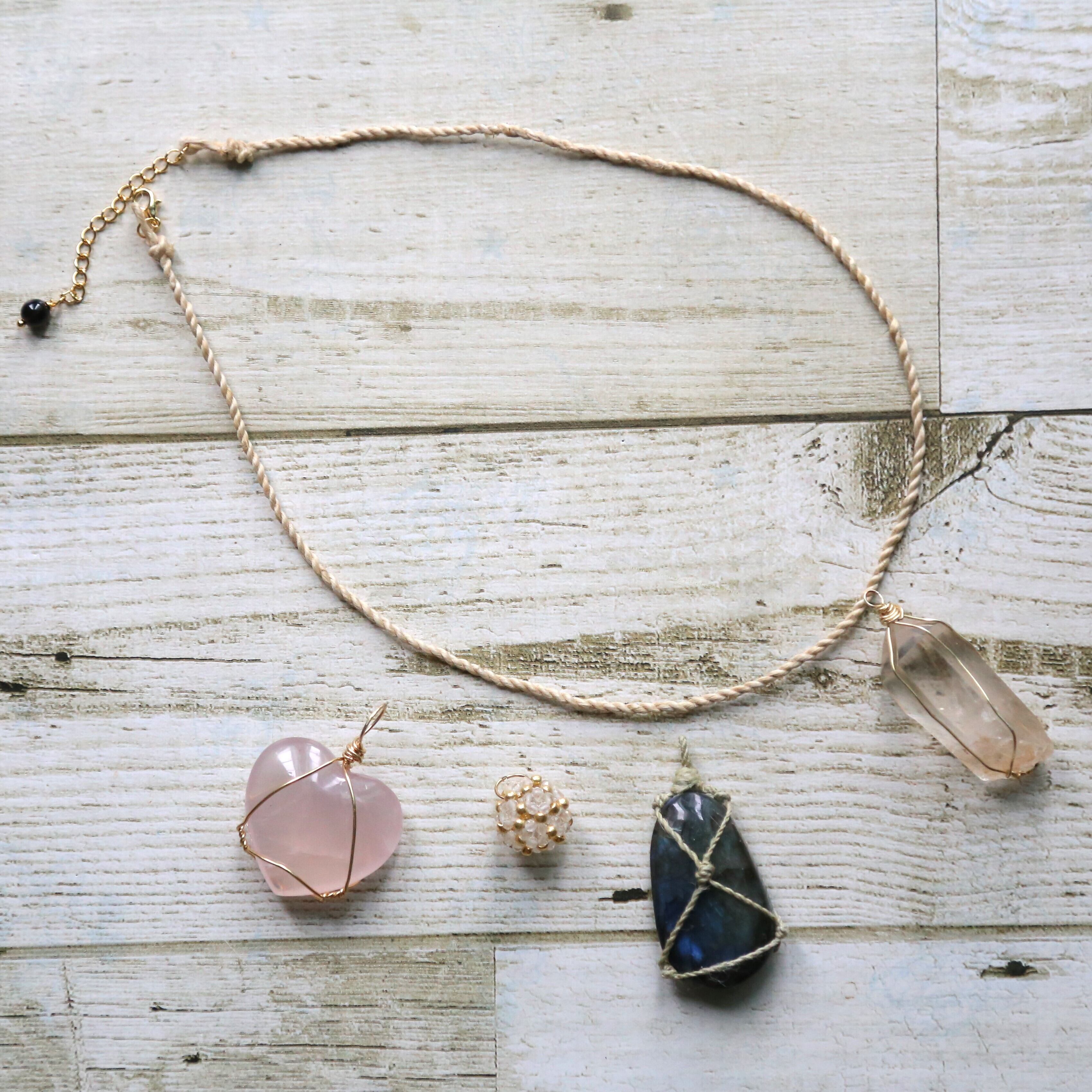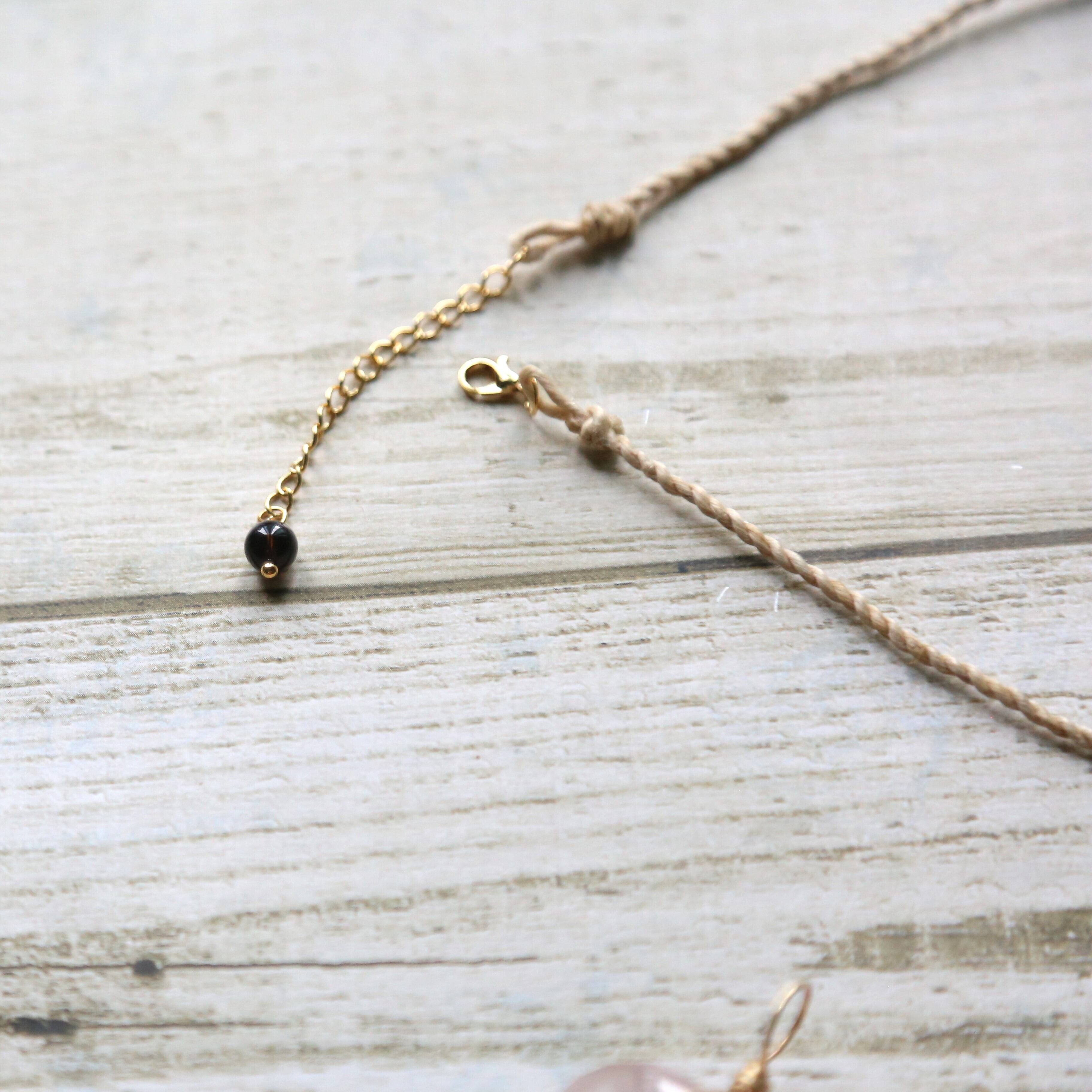 精麻のより紐に、アジャスターで長さ調整可能な金具(16金コーティング)、そしてエネルギー的にも守っておきたい首の後ろ側にあたるアジャスター部分にはモリオンを付けました!