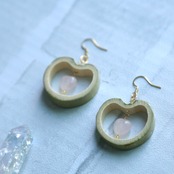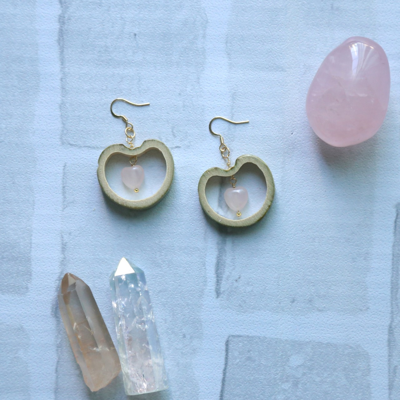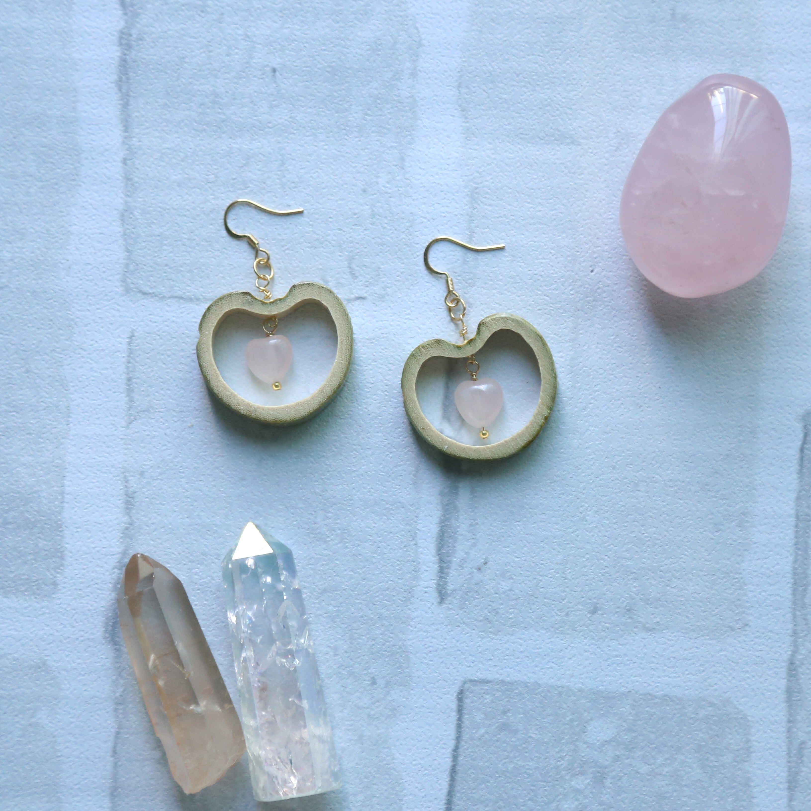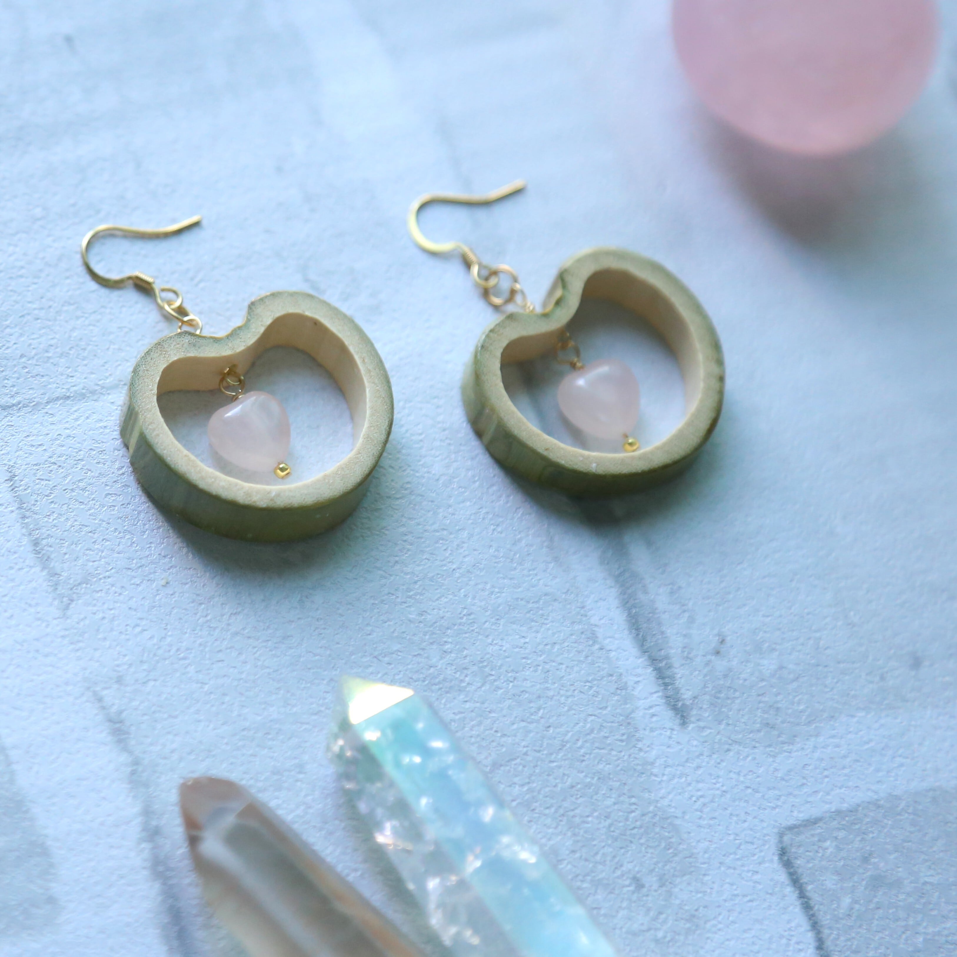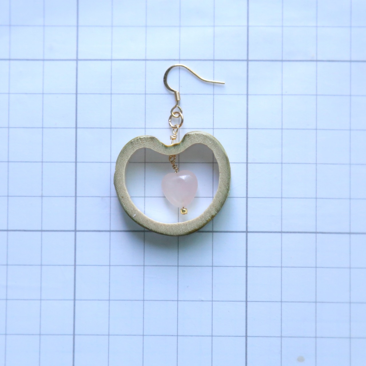 ハート♡型の竹とハート♡のローズクォーツのピアスです