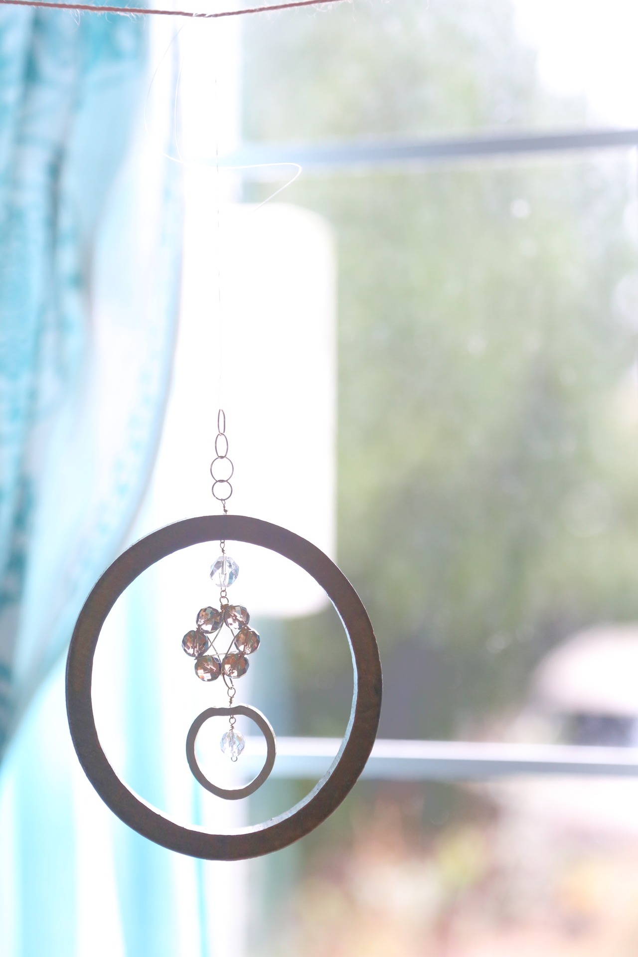 竹には少し濃い目のこげ茶色のニス、小さな輪は透明のニスを塗布しています