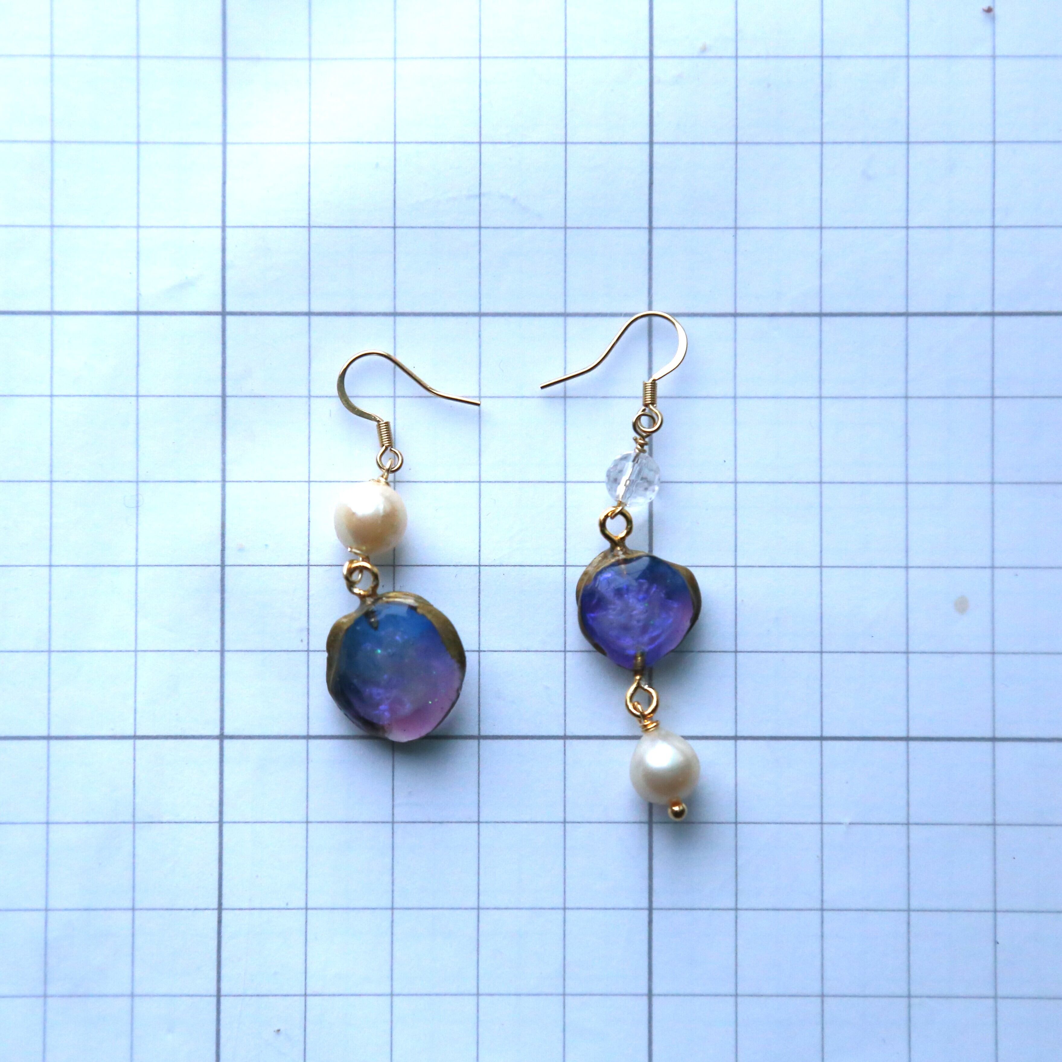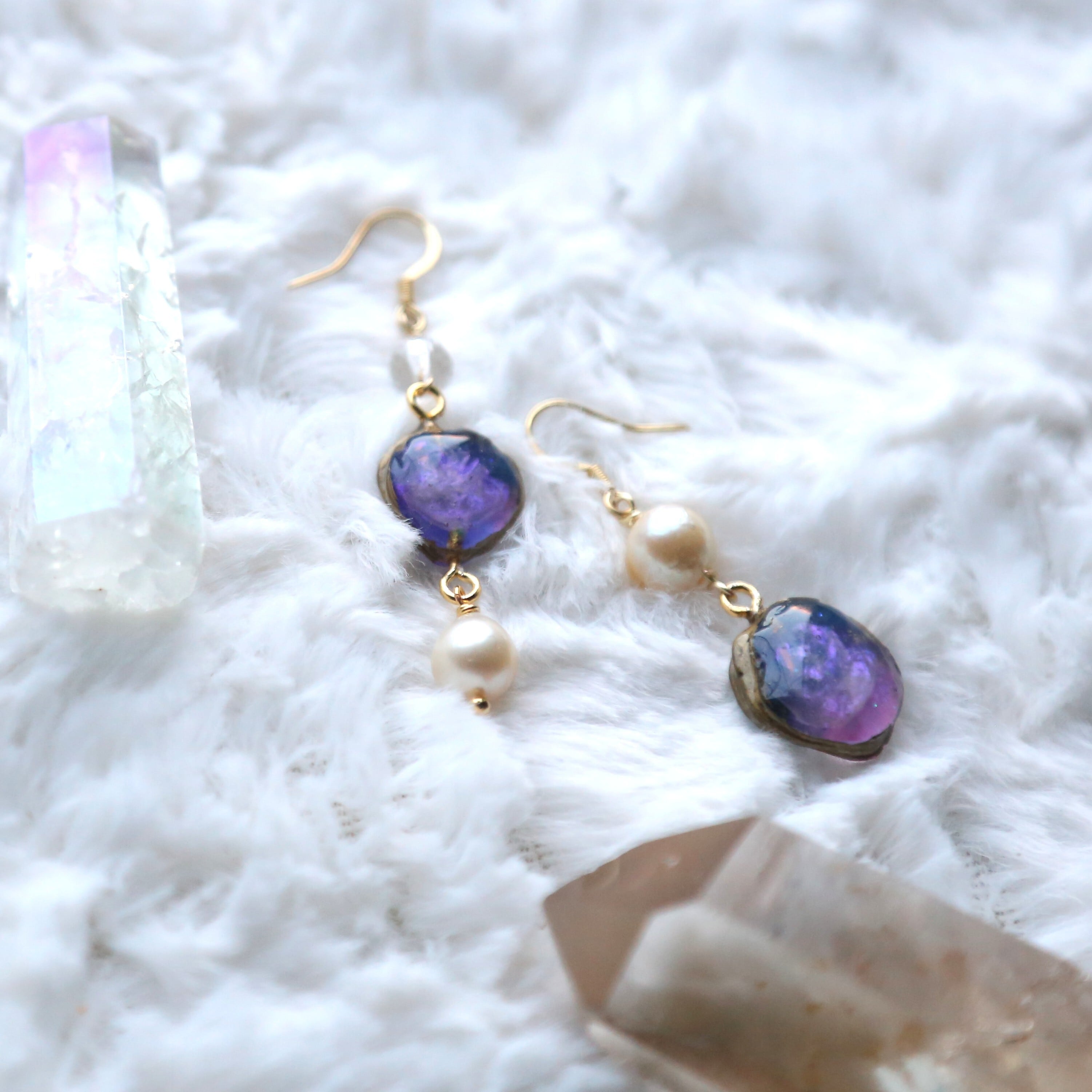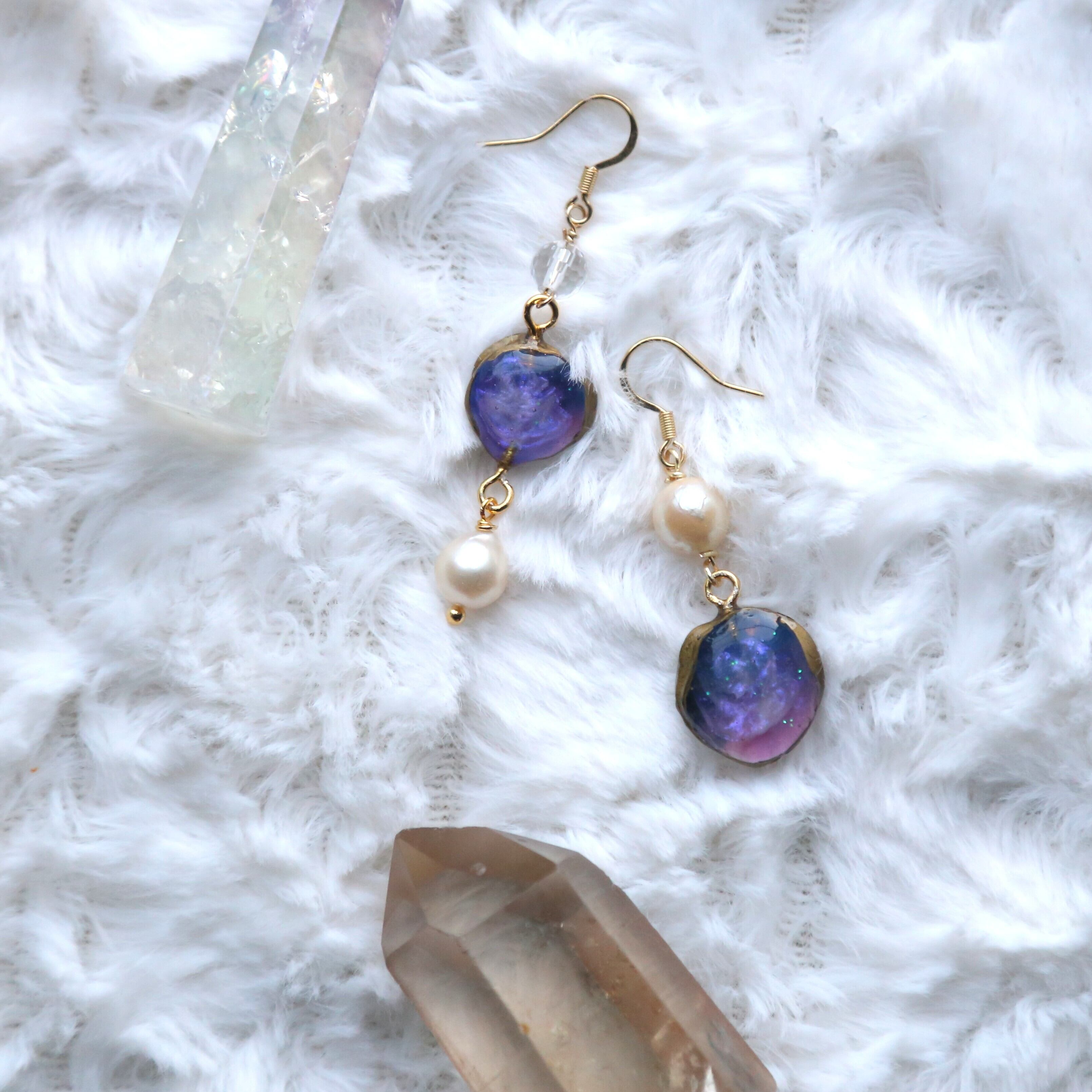 柔らかい優しい色の宇宙♡にパール(本真珠)にキラキラカットの水晶のピアスです