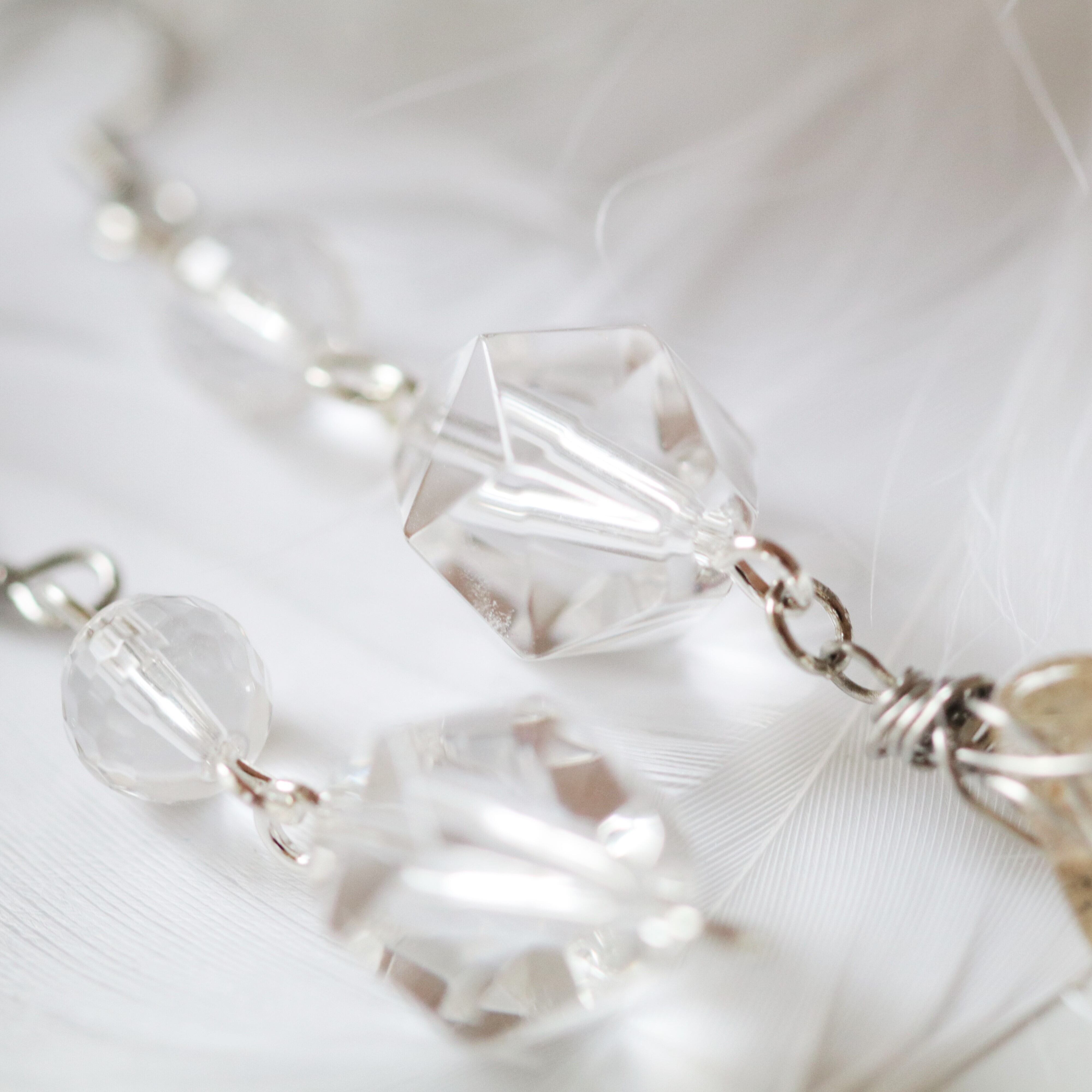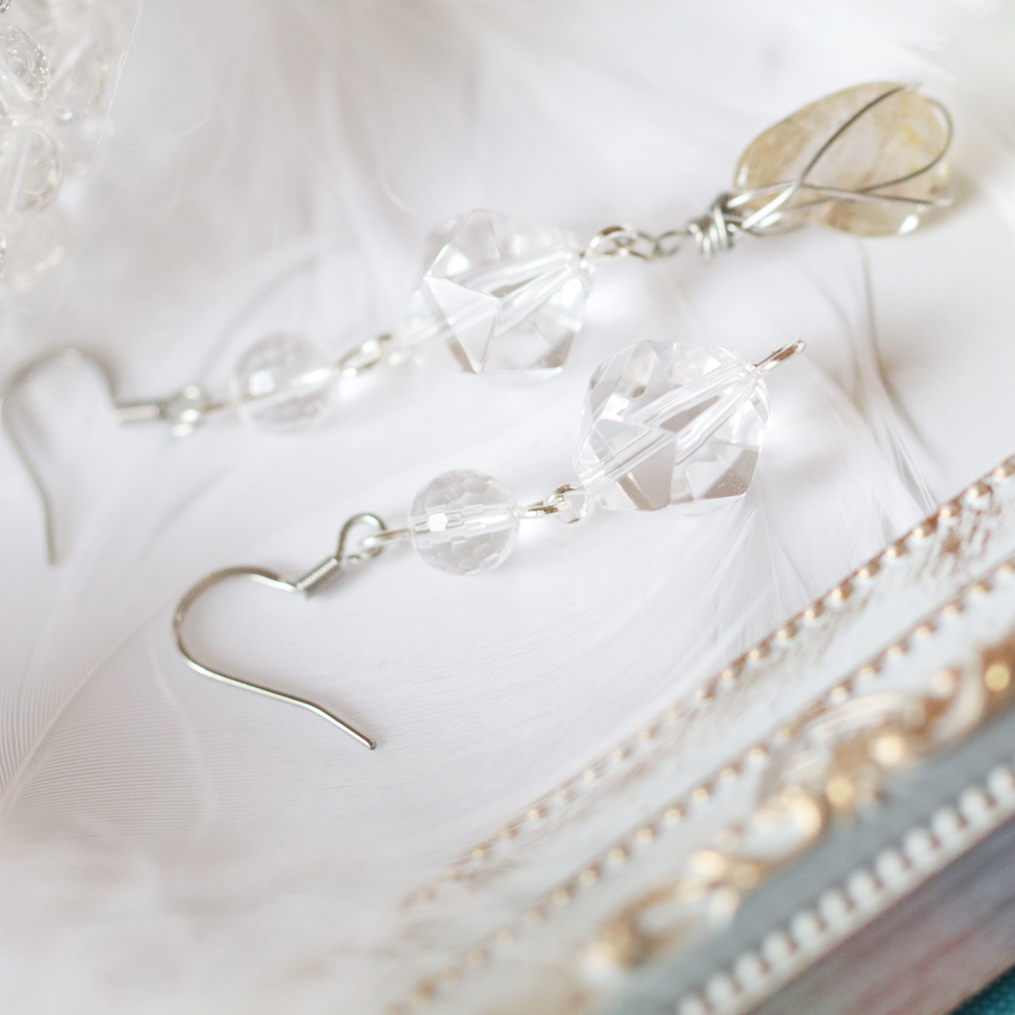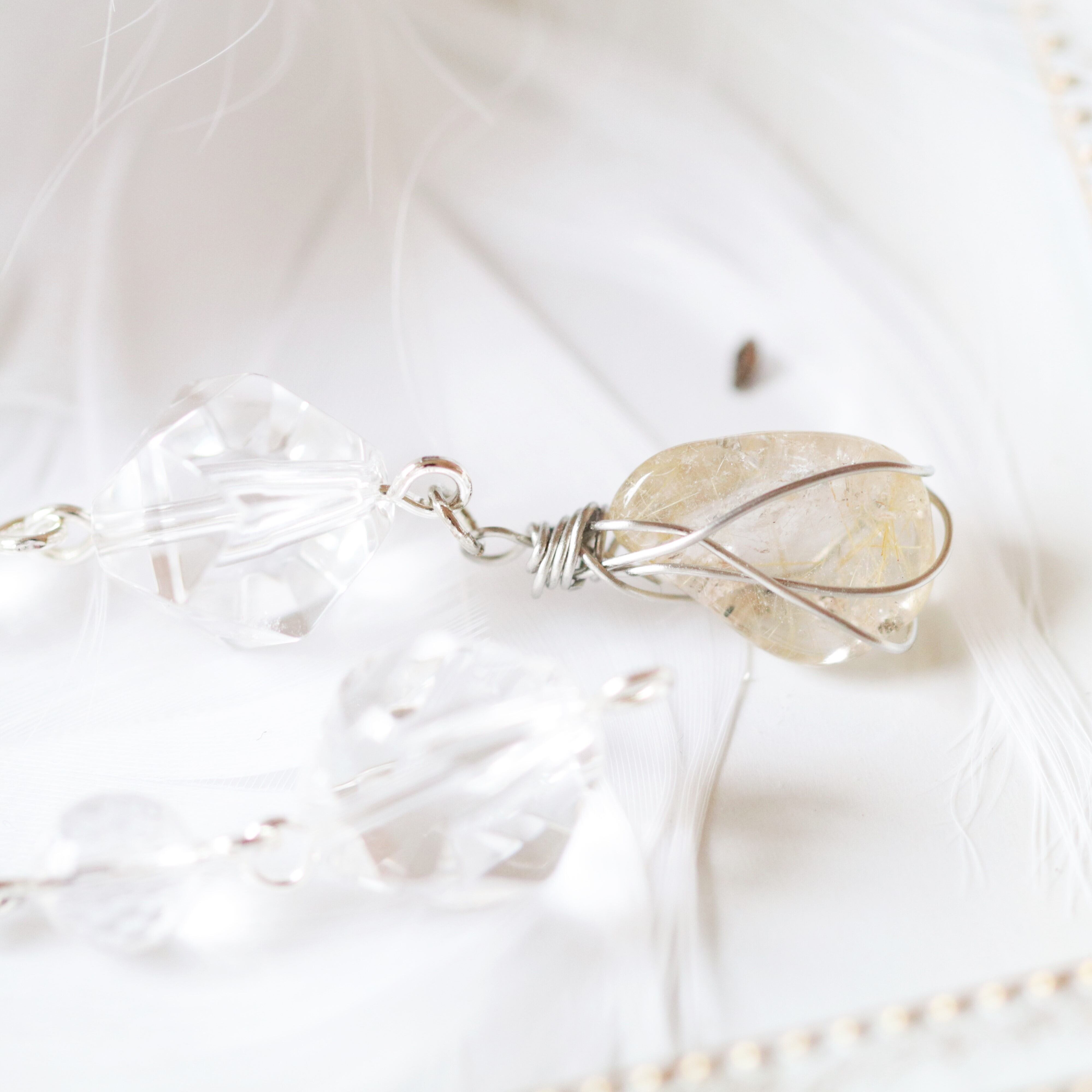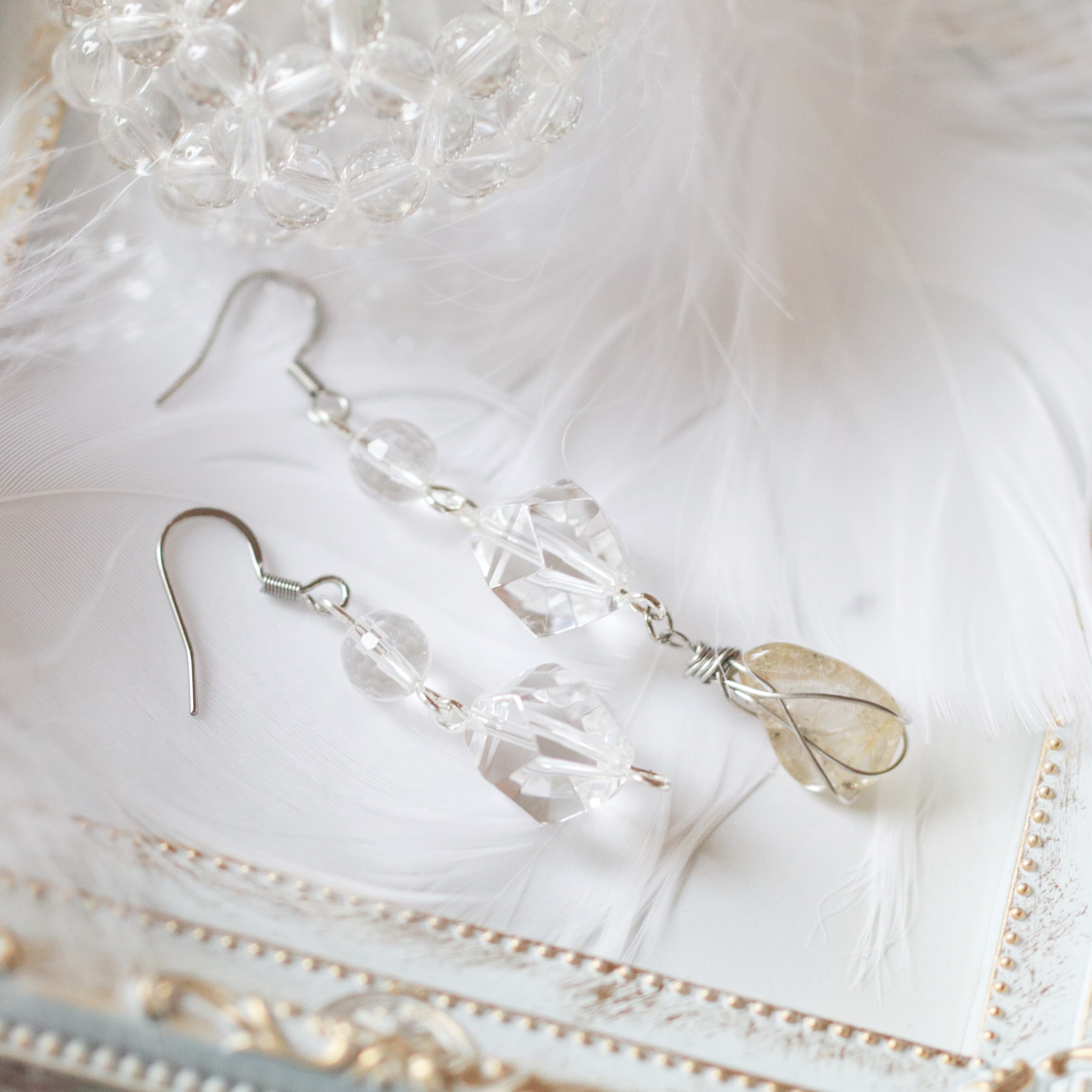 ルチルクォーツに水晶を合わせたアシンメトリー(左右非対称)のピアスです。