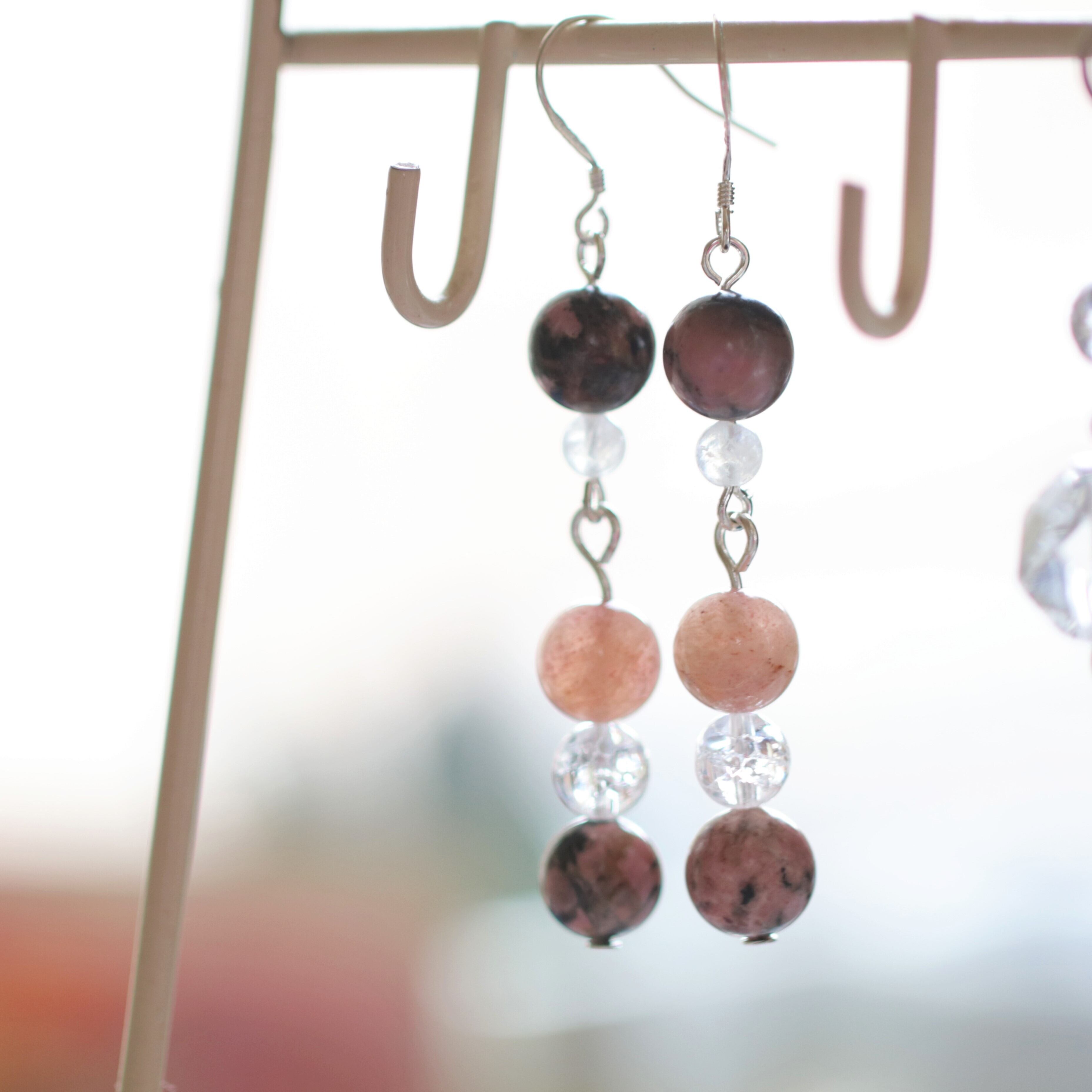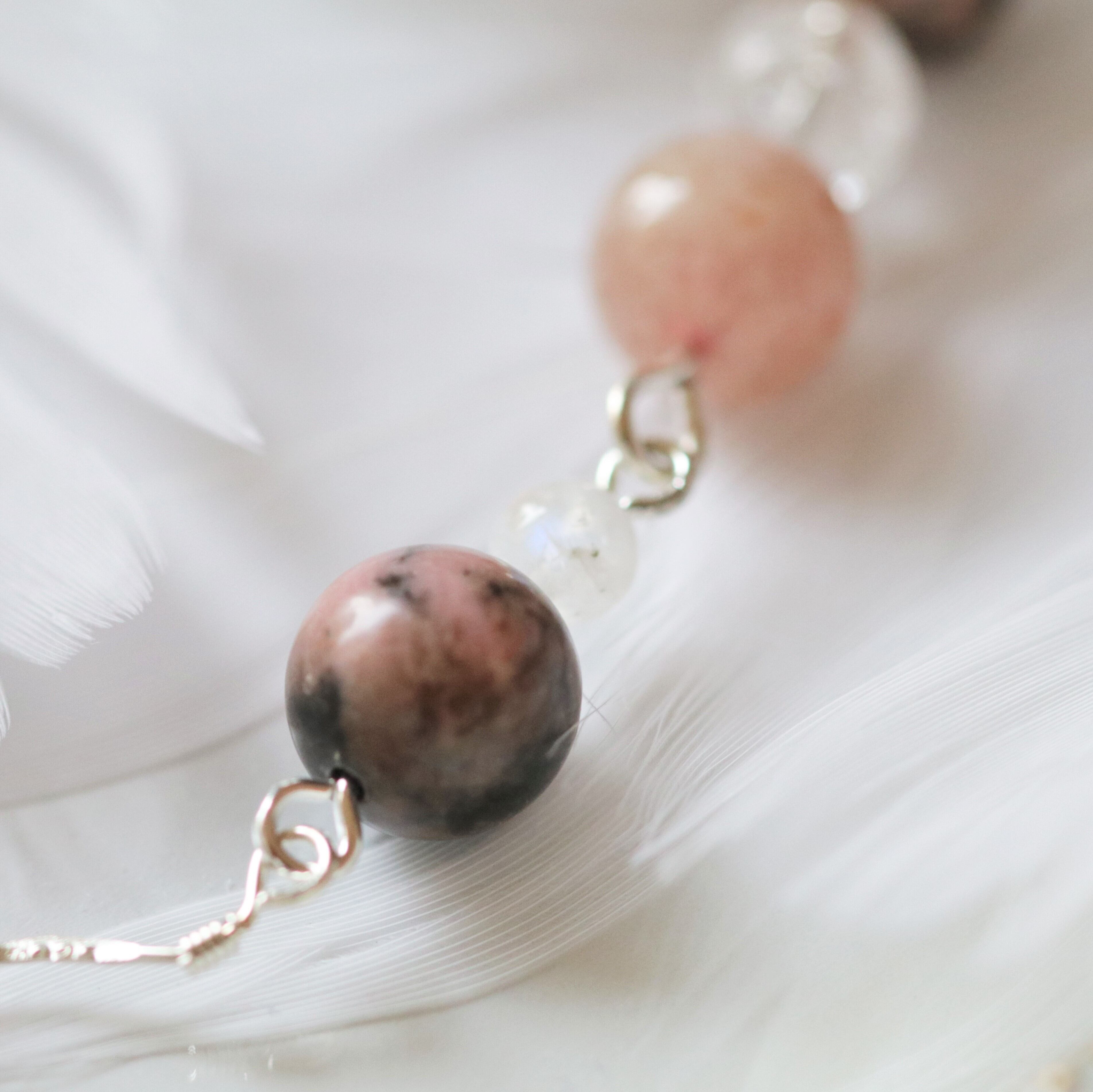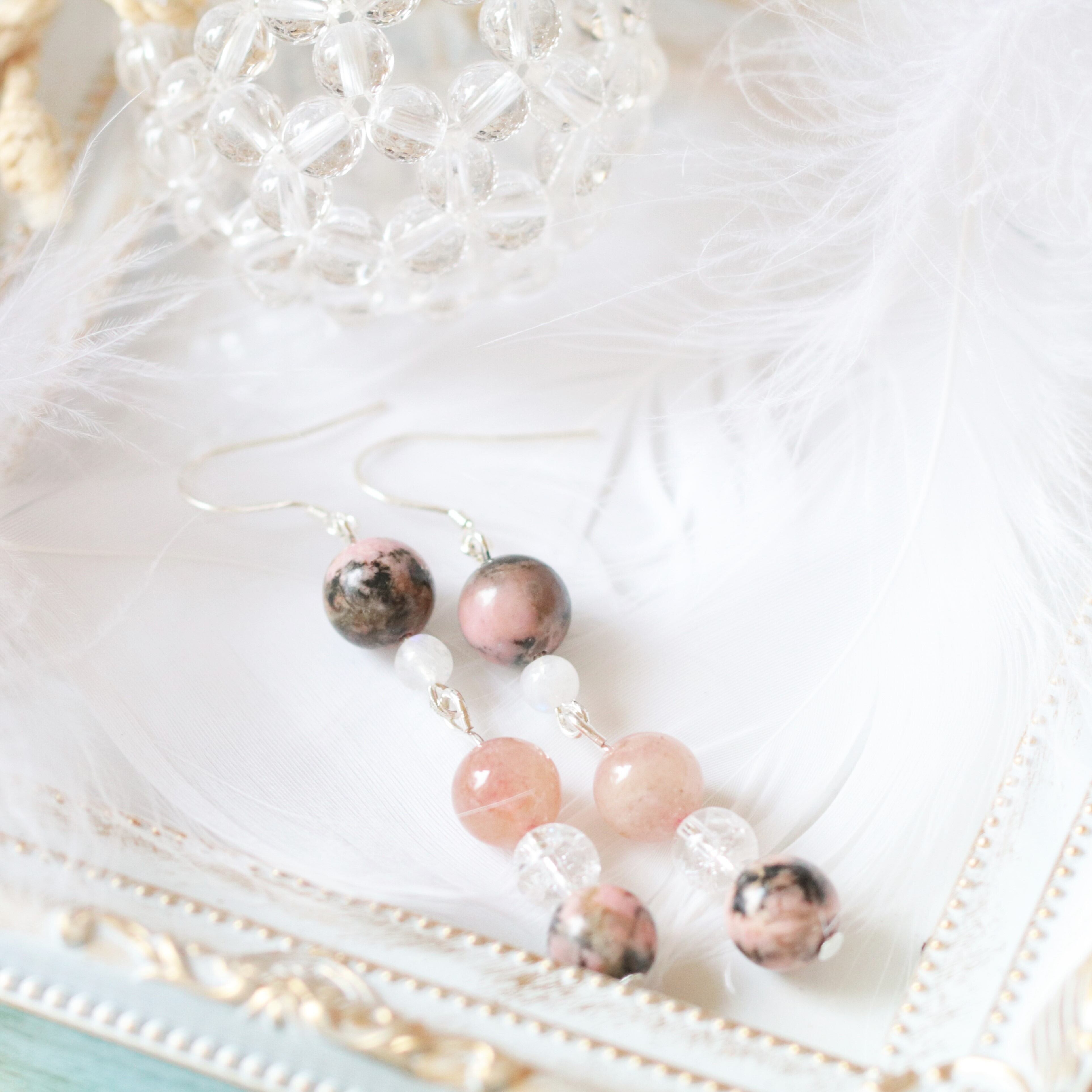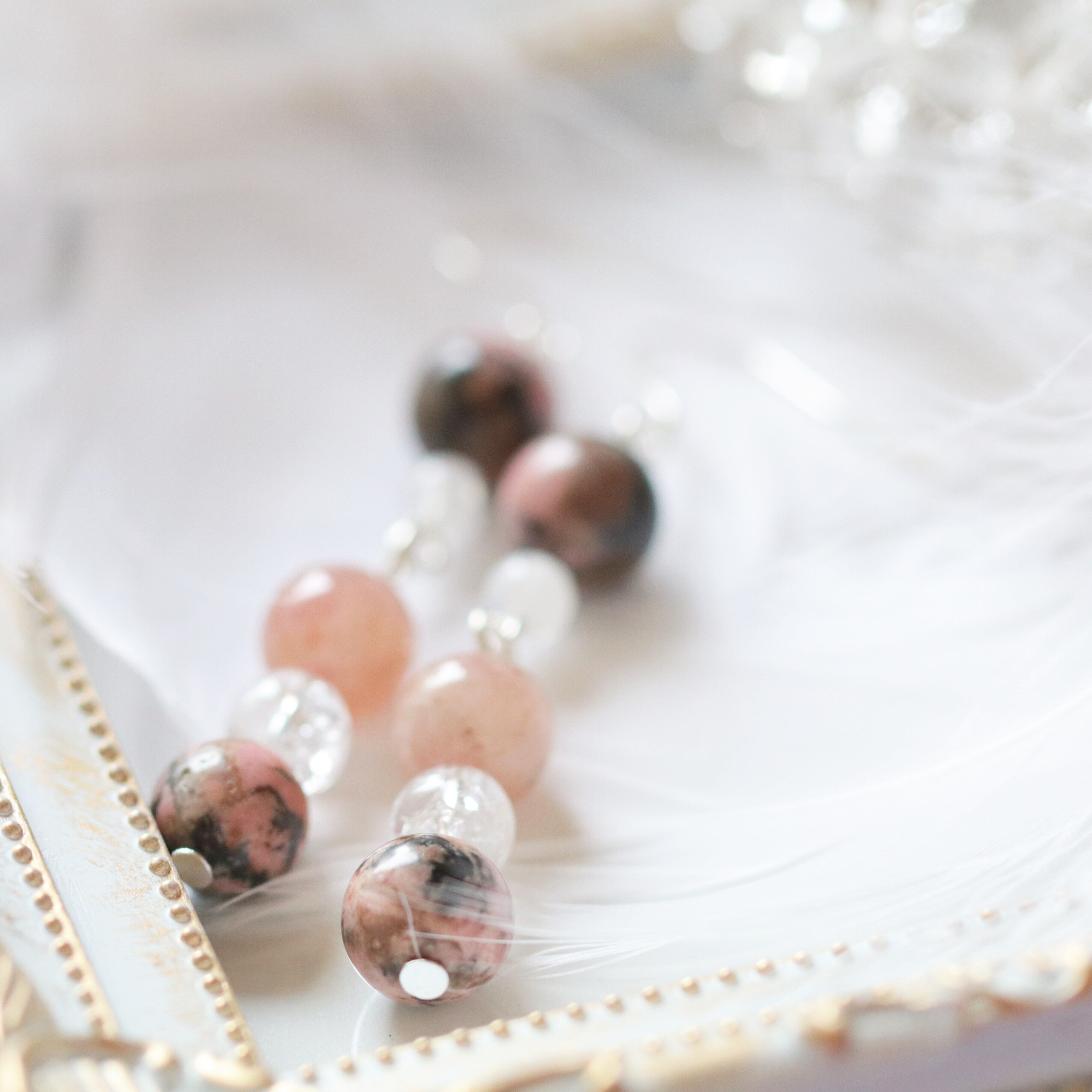 ロードナイト(ピンクとベージュのマーブル)にふんわりピンクのストロベリークォーツ(真ん中の石)、に水晶とムーンストーンを合わせました♡