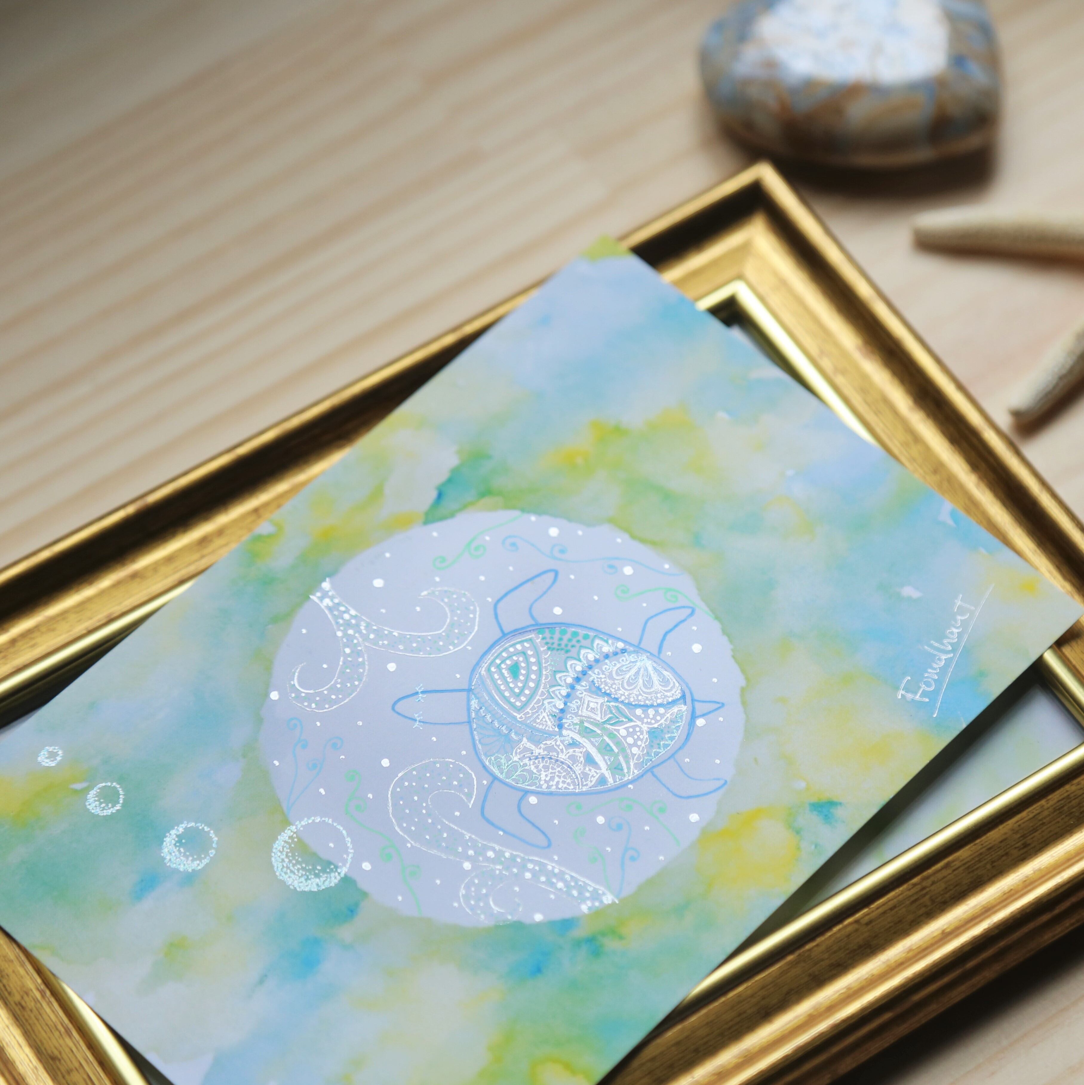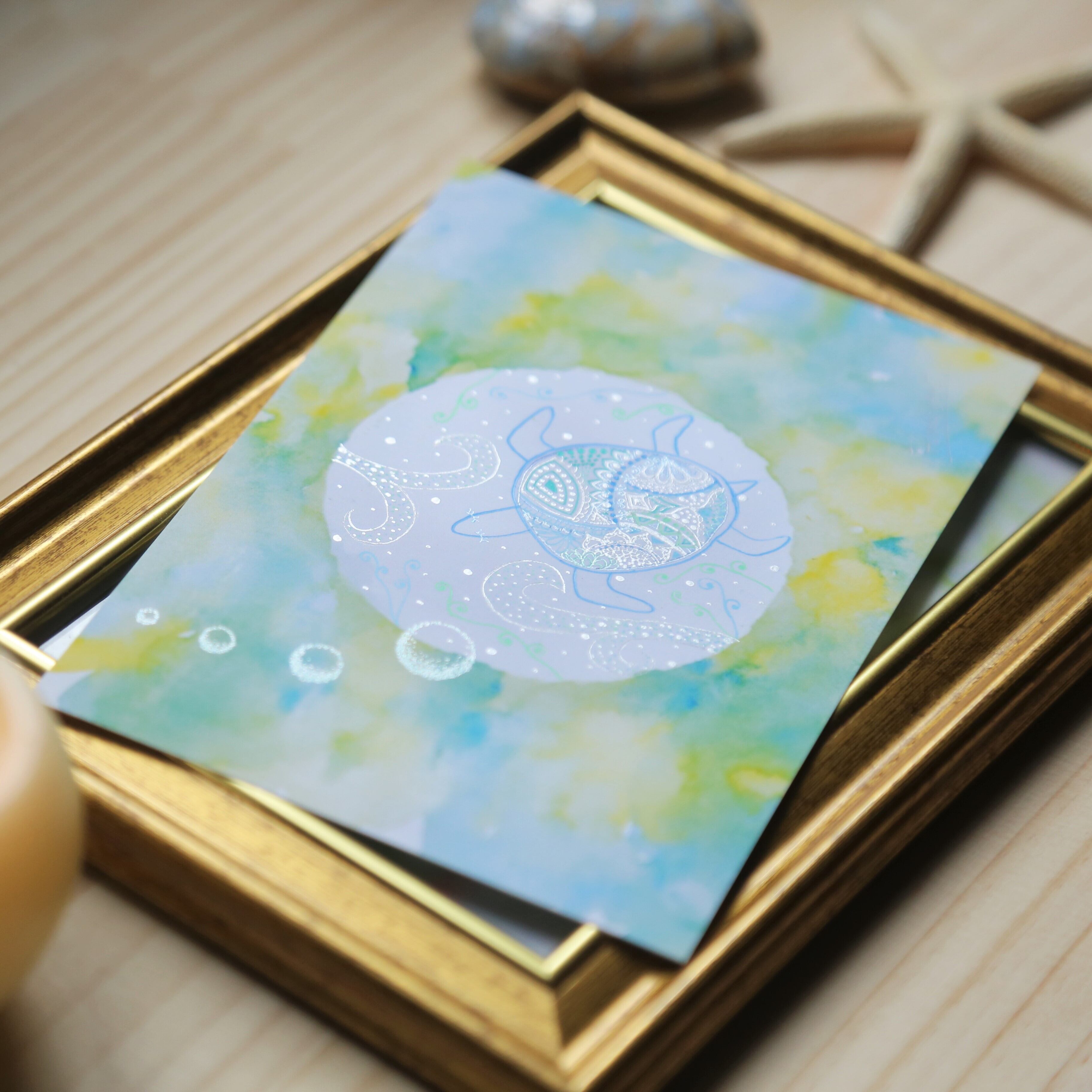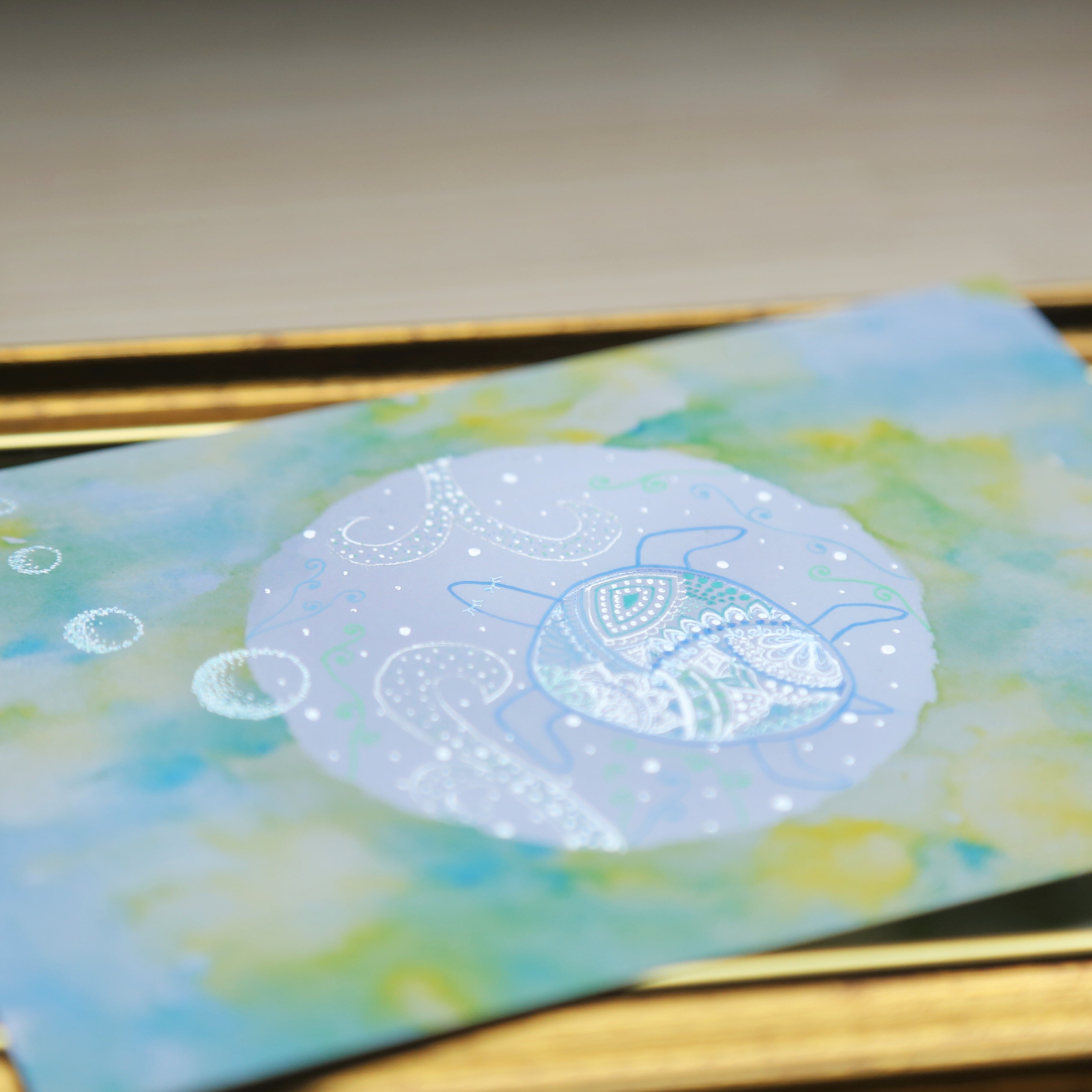 こちらは水道水を使わず、海の水で描いた水彩画(を印刷したもの)に