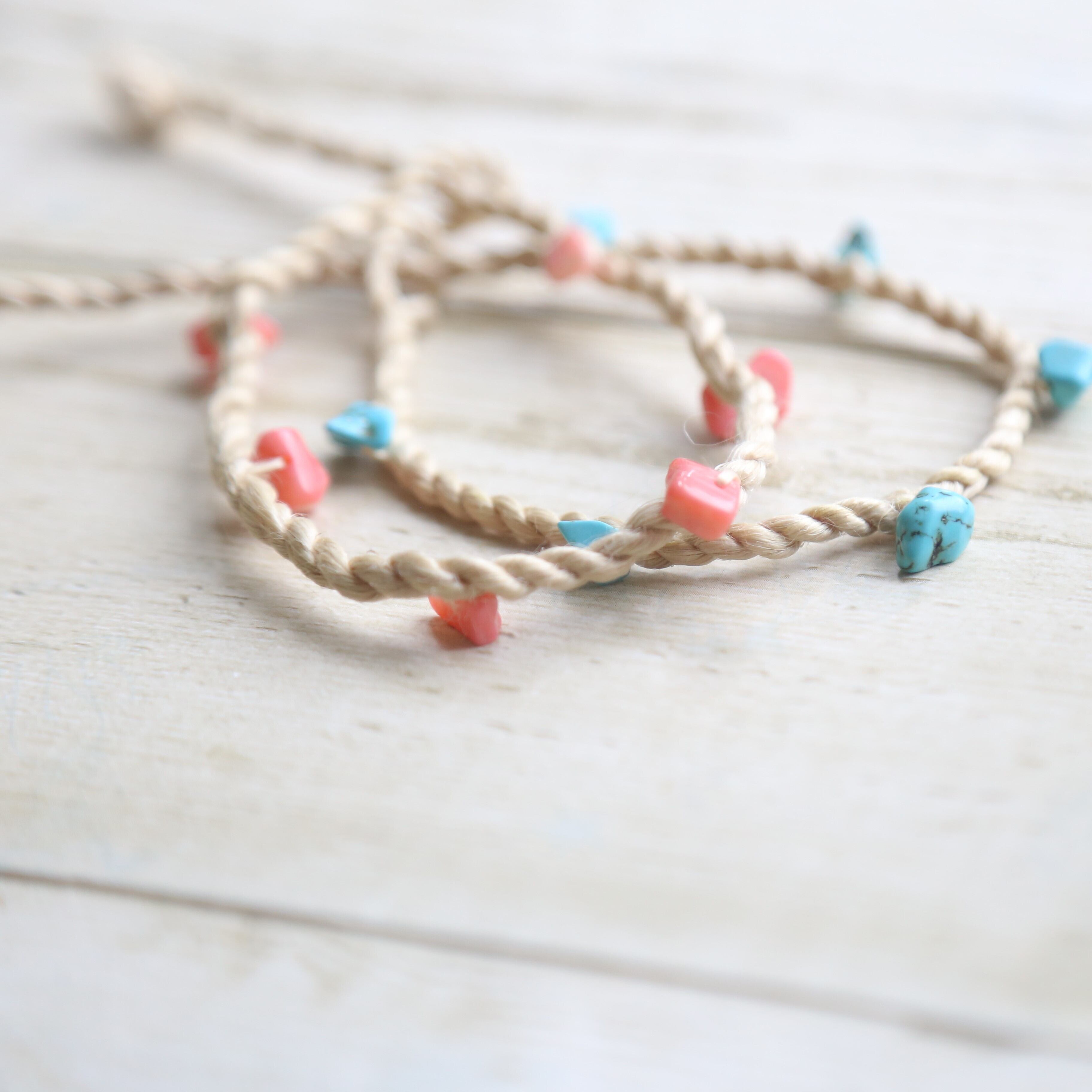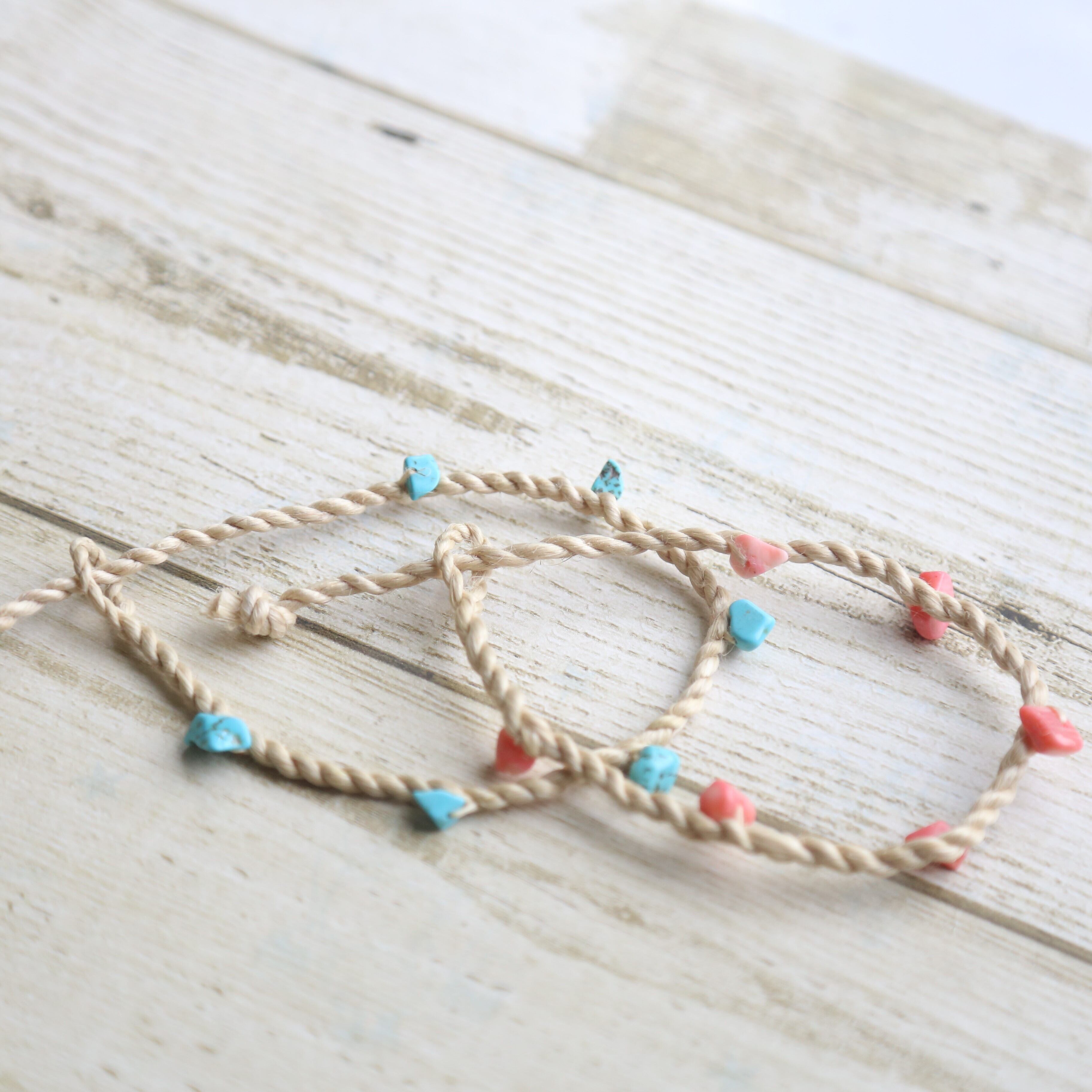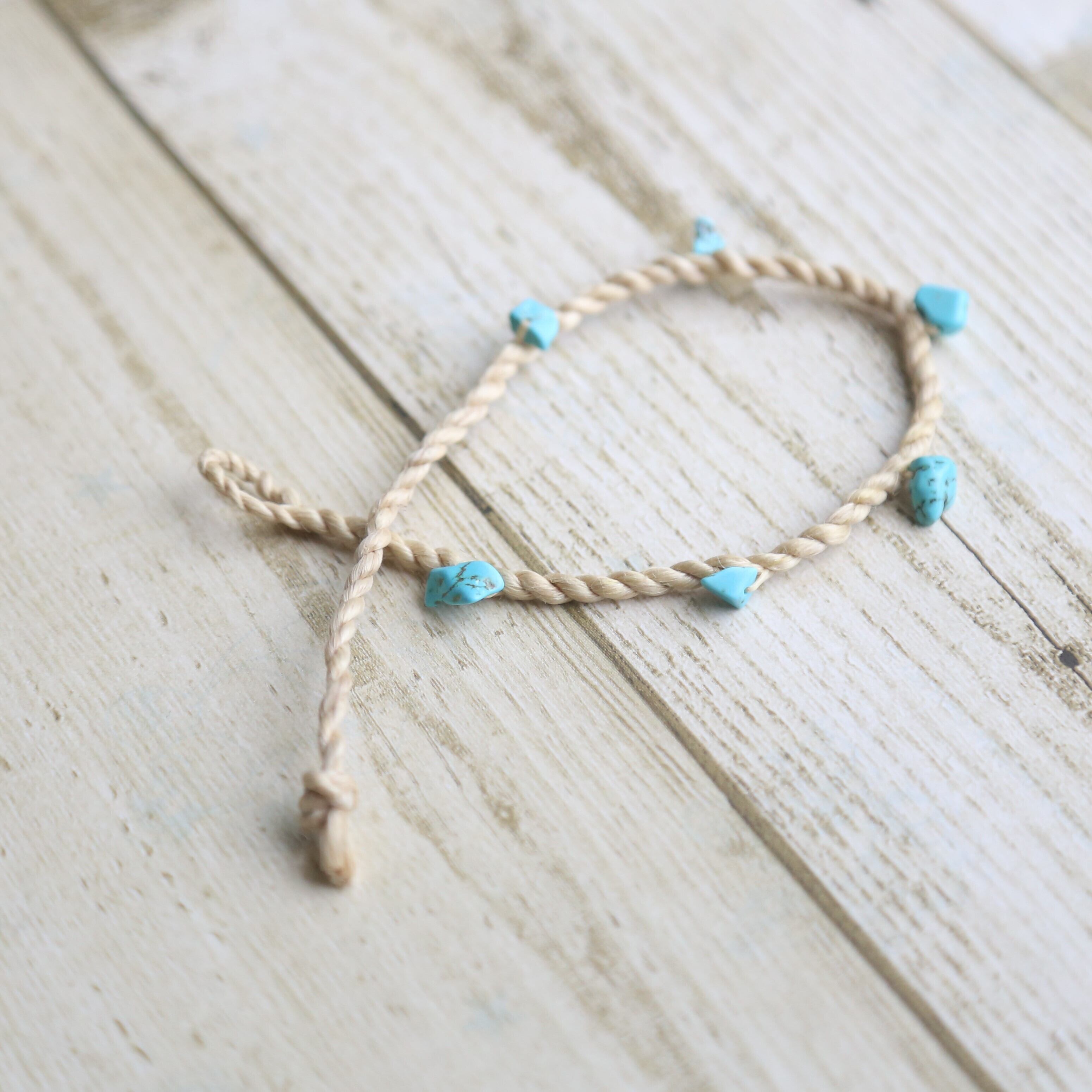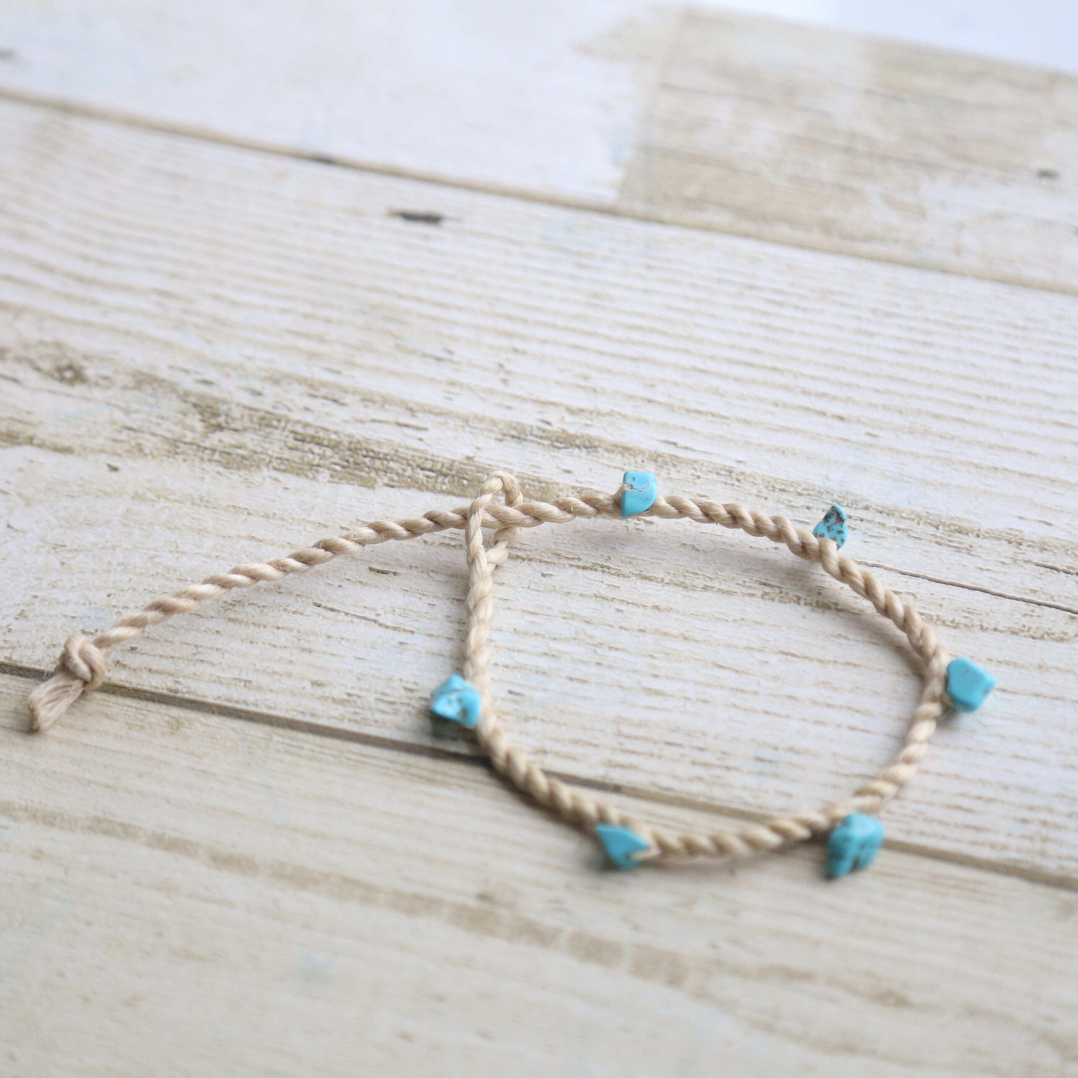 精麻にターコイズを一粒一粒編み込んだアンクレット