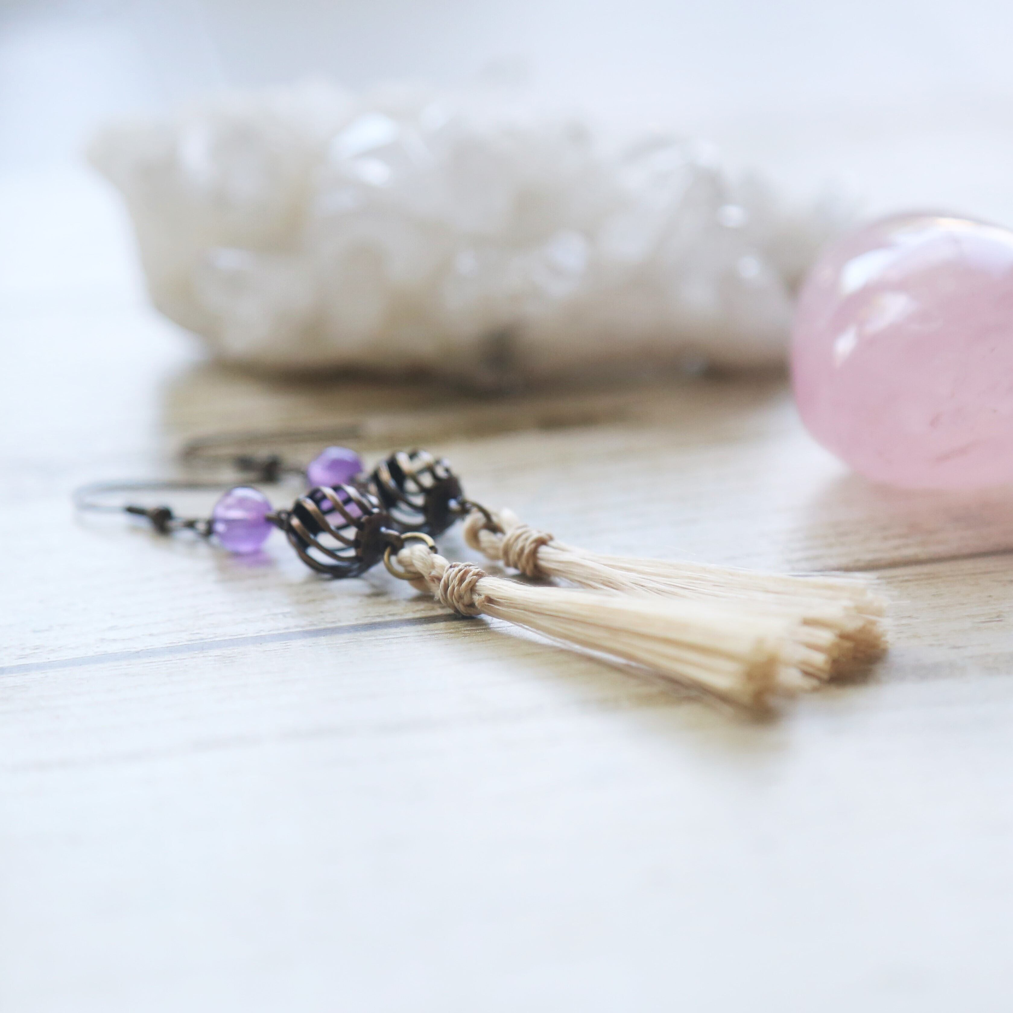 アメジストのデザインの綺麗な精麻のピアス(イヤリングに変更可)です♡