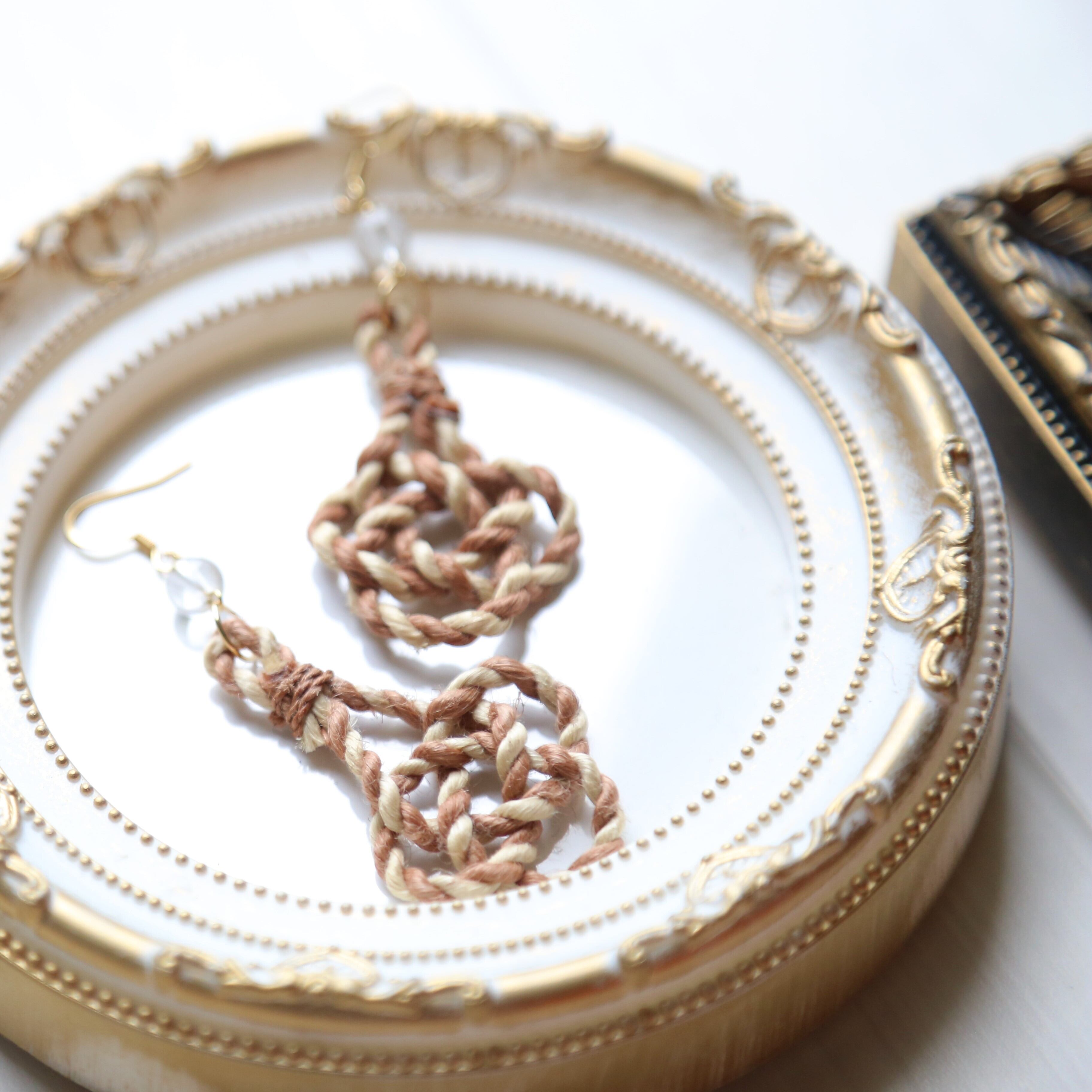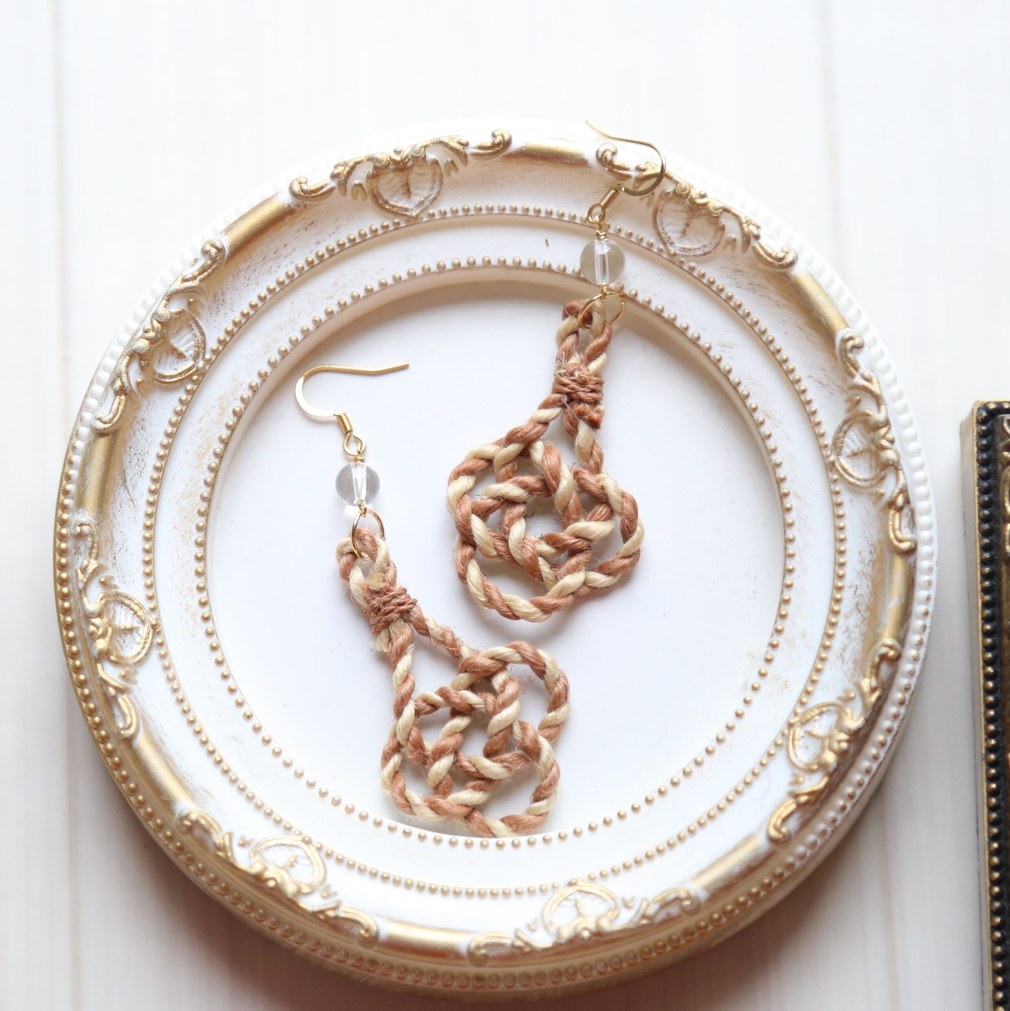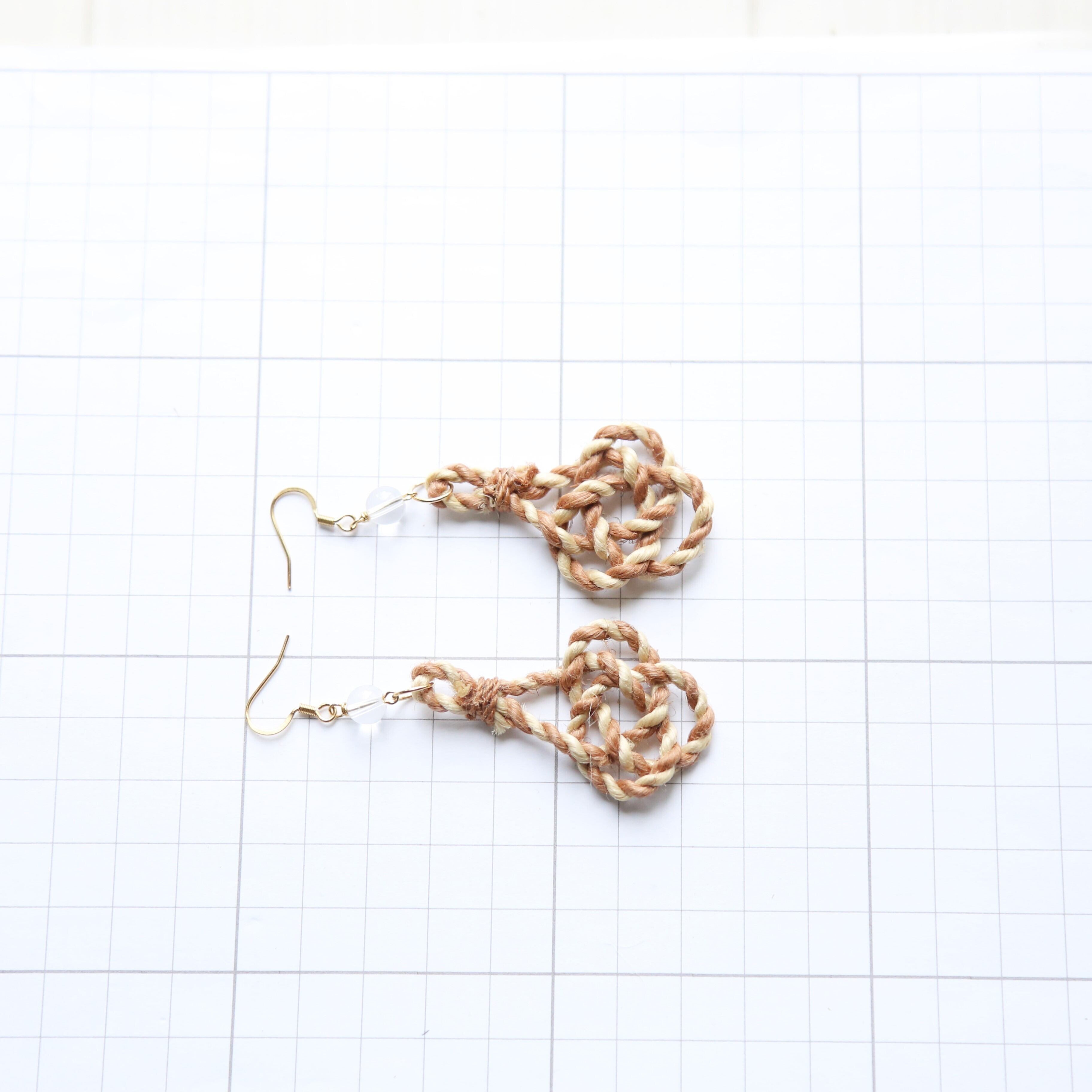 無染色の精麻に松ぼっくり染めの精麻、そして水晶を合わせましたピアス(イヤリング)です