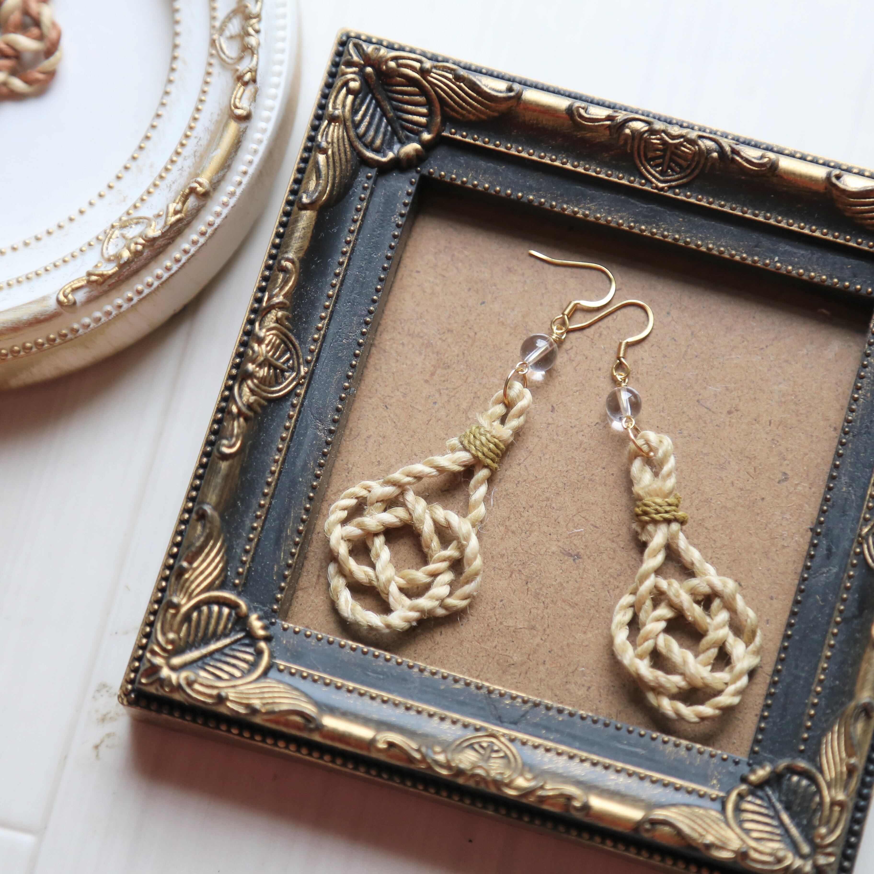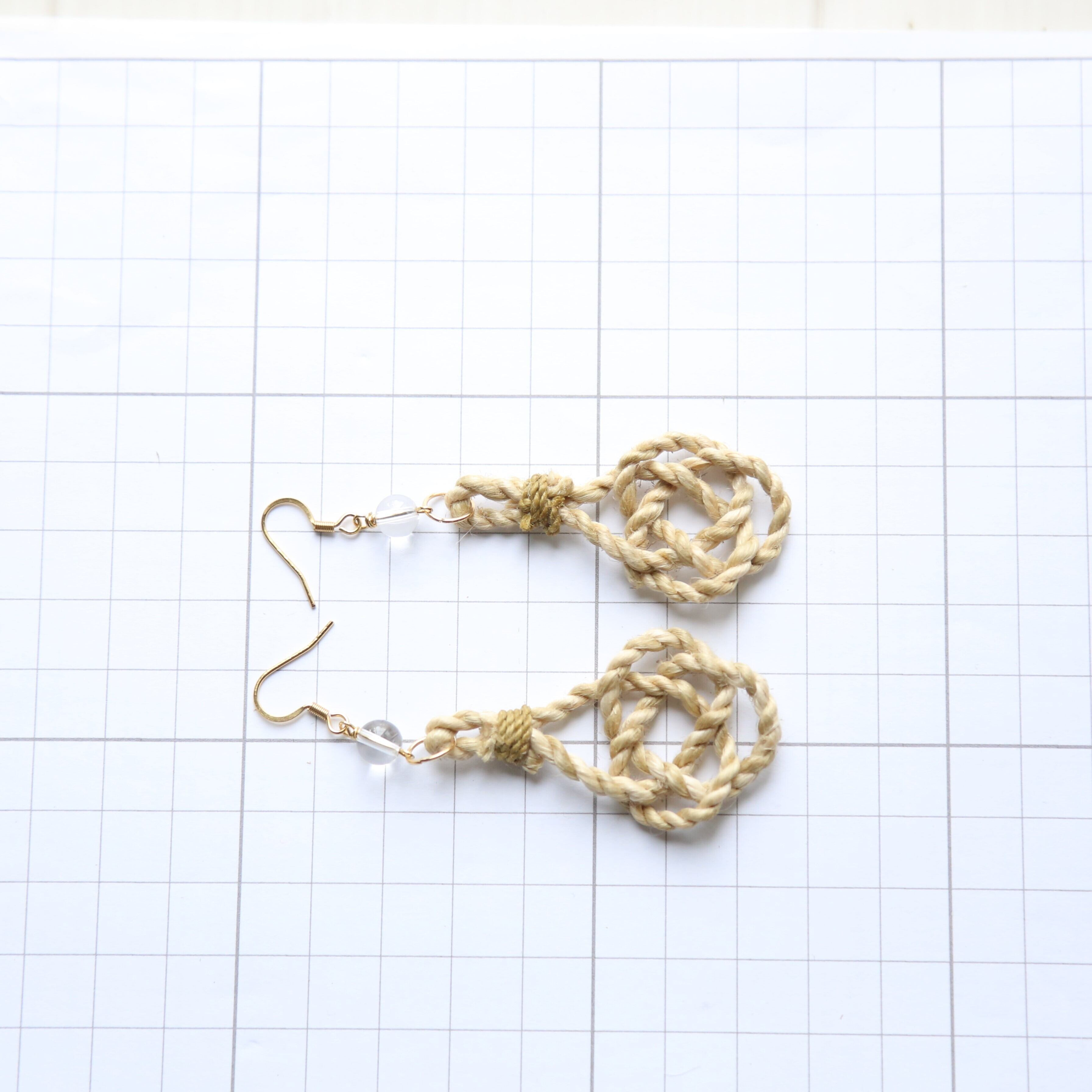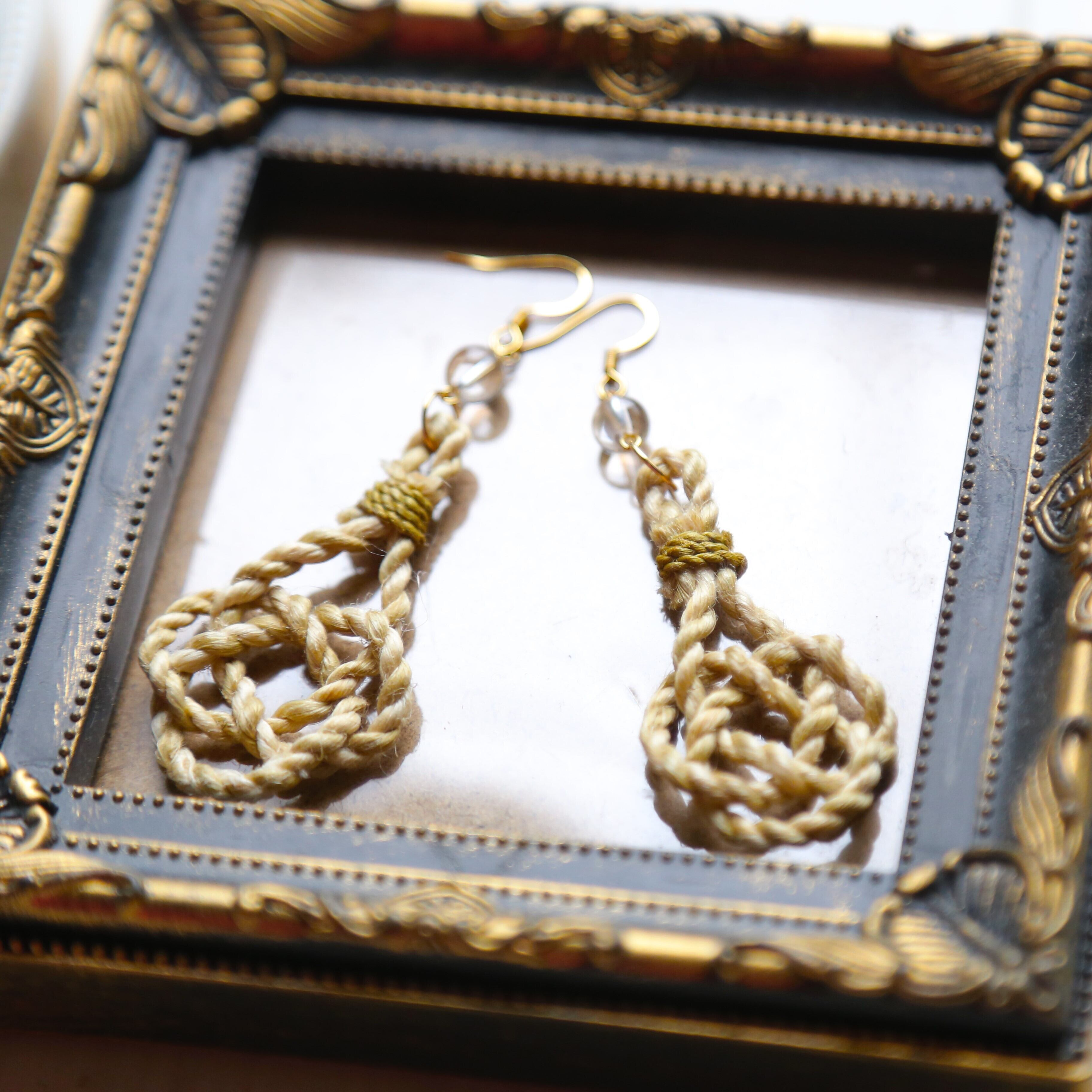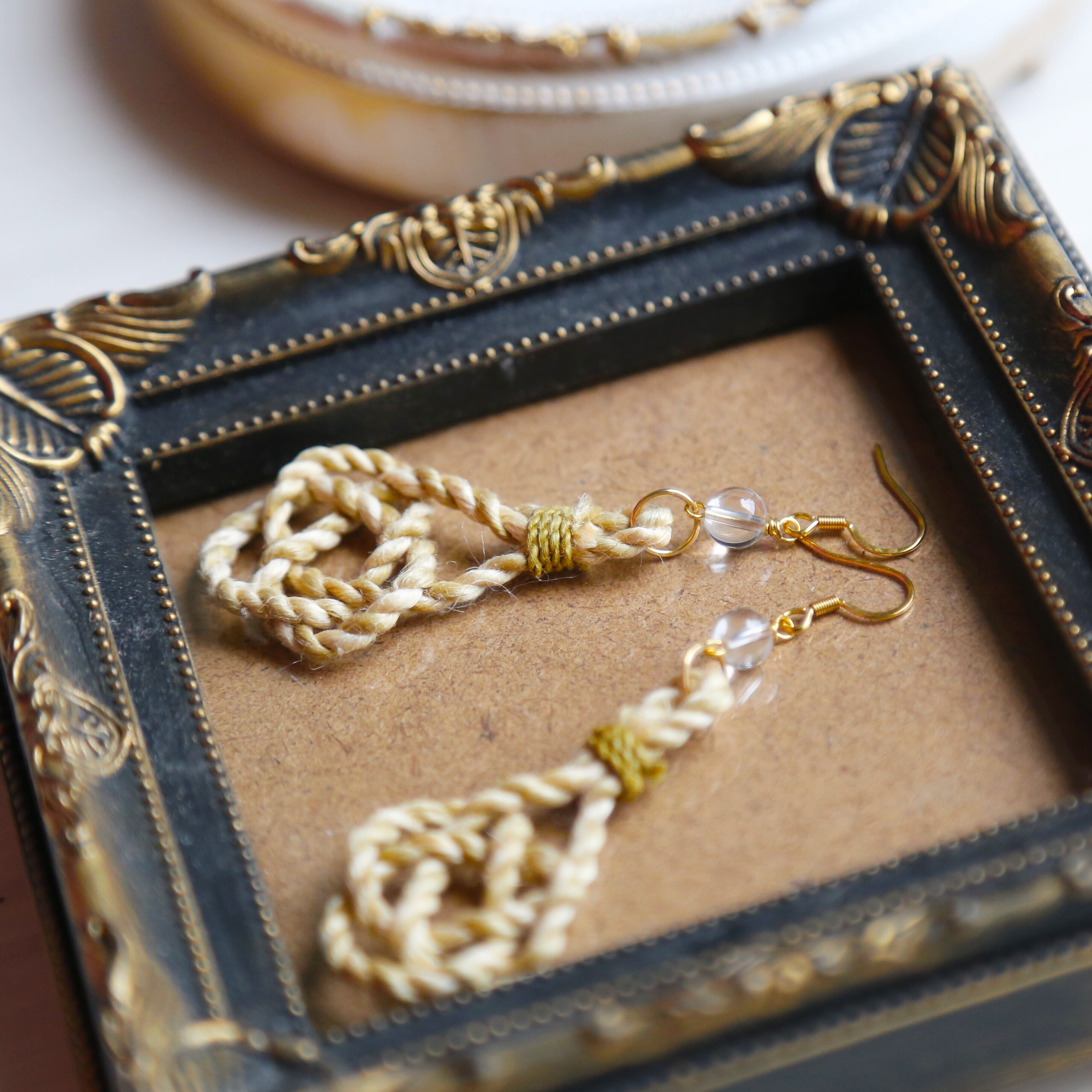 こちらは無染色の精麻にヨモギ染めの精麻、葛の葉染めの精麻、そして水晶を合わせましたピアス(イヤリング)です
