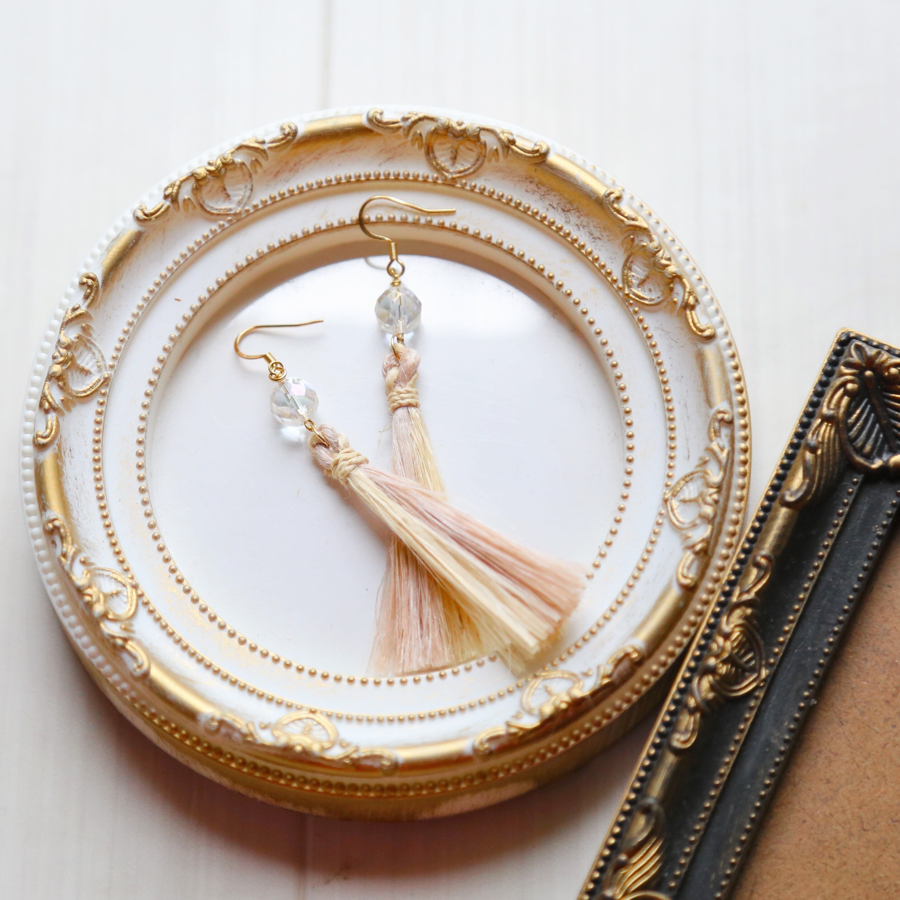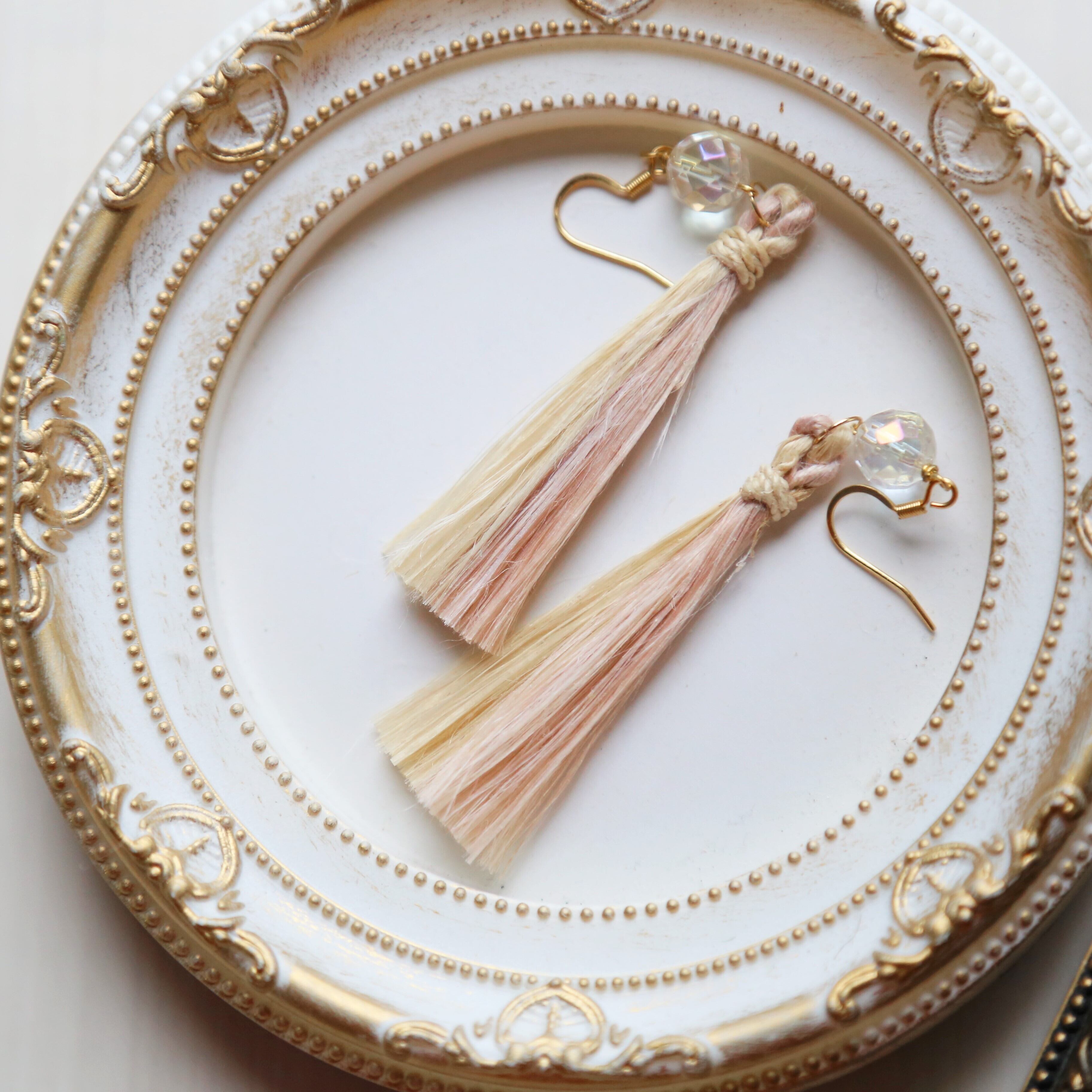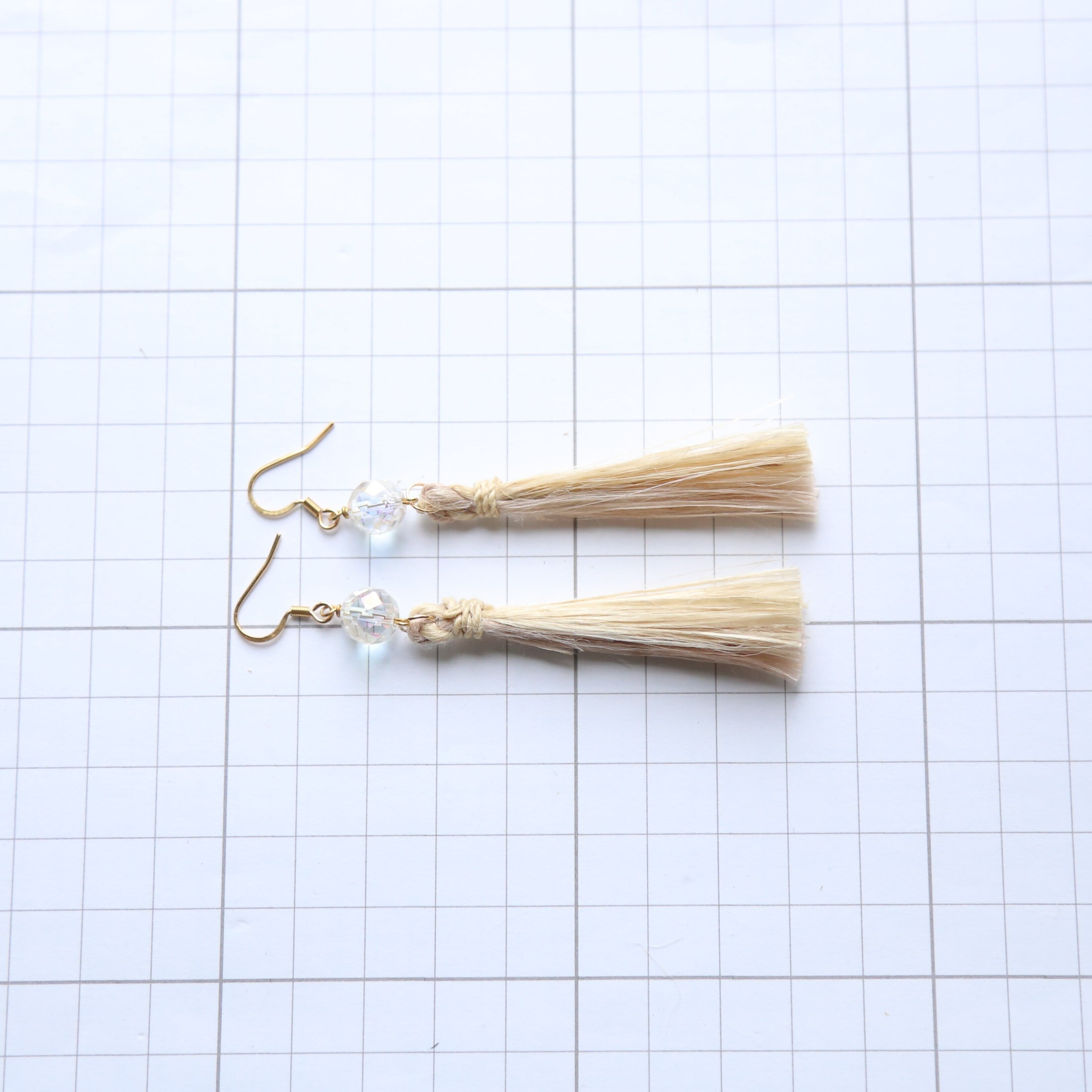 こちらは無染色の精麻にビワの葉染めの精麻、そしてオーロラ水晶を合わせましたピアス(イヤリング)です